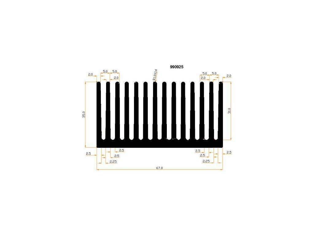 Chladič Al 990925 67x35x70mm Rth=2,2°C/W/100mm, 3,27kg/mDoplňkové parametry