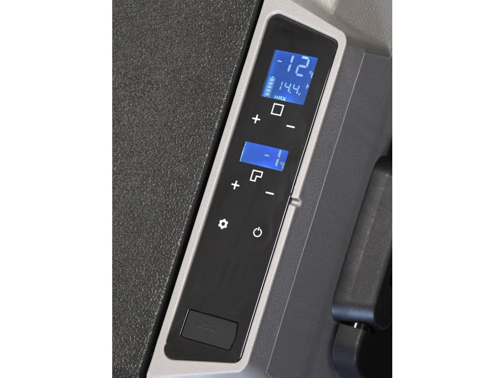 Dále je box vybaven inteligentním systémem ochrany před vybitím připojeného akumulátoru, který lze nastavit skrze menu přístroje. Chladící box je osazen displejem s veškerými ovládacími prvky.
