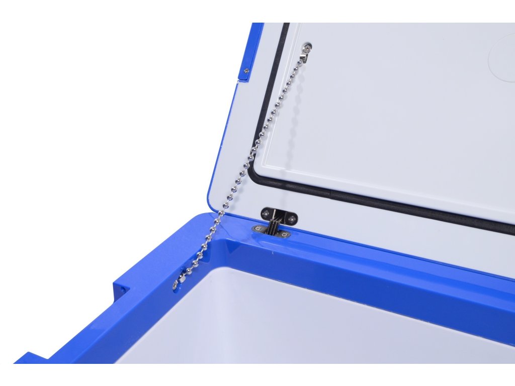 Dvířka chladicího boxu jsou variabilní, umožňují jak podélné otvírání, tak i snadnou úpravu na příčné otevírání. Díky postranním madlům z odolného plastu je tento box snadno přenosný.