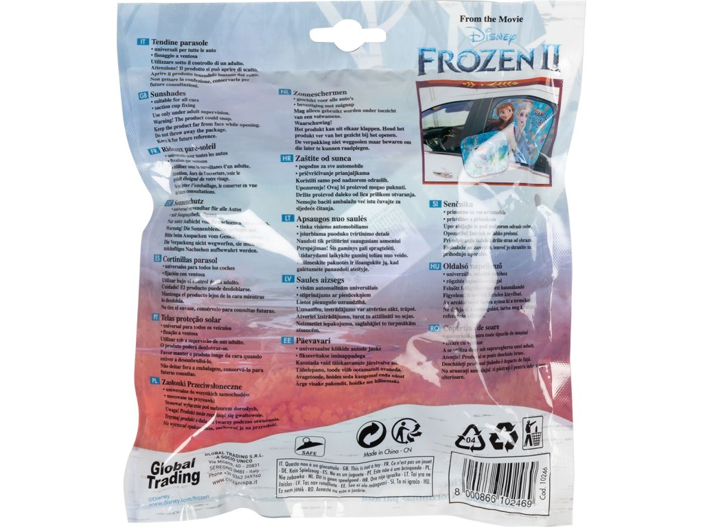Sluneční clony brání pronikání slunečních paprsků do vozidla. Sada obsahuje 2 ks clonek s dětským motivem Ledové Království 2. Jsou určeny na zadní, nebo boční skla automobilu.