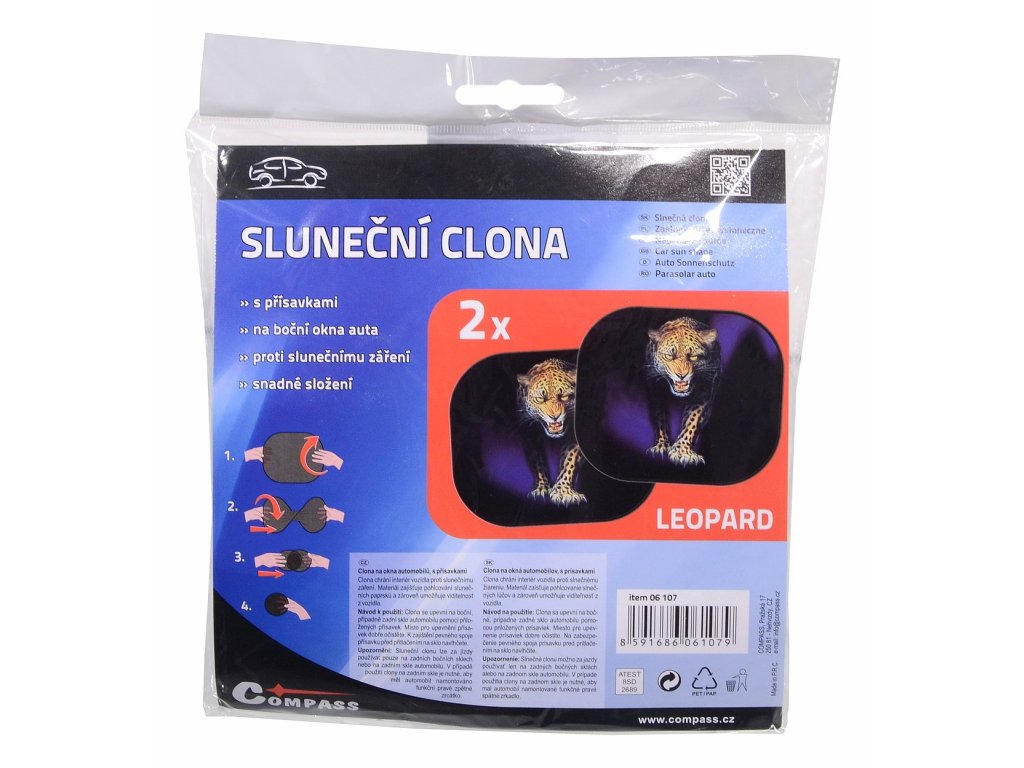 Sada 2 kusů slunečních clon s přísavkami na okna automobilu. Způsob perforace materiálu zajišťuje absorpci cca 70% slunečních paprsků. Po použití lze clonu pohodlně složit zpět do obalu. Tvar clony - ovál, potisk motiv Leopard.