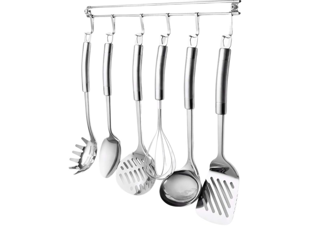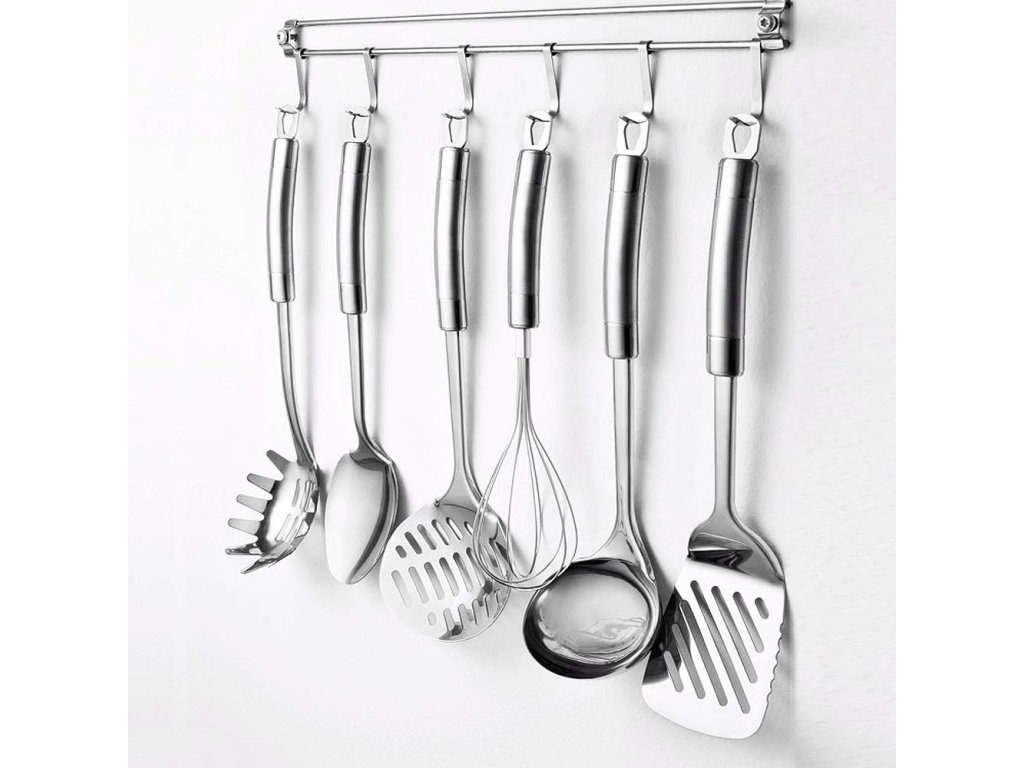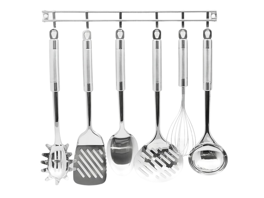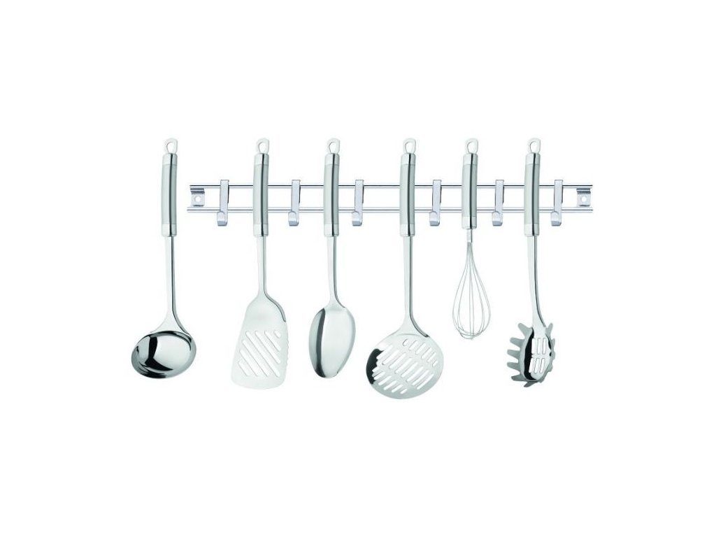 -Materiál: nerezová ocel/chrom/nikl-barva: stříbrná-kombinace matného a leštěného povrchu-sada obsahuje:-naběračka, naběračka na špagety-servírovací lžíce, šlehací metla-pěnovačka, obracečka -délka lišty: 40cmDoplňkové parametry