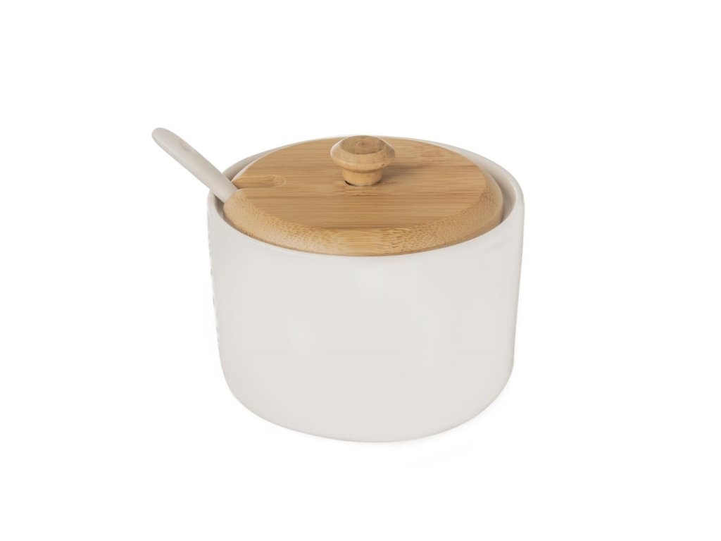 Cukřenka s víčkem a se lžičkou.Materiál porcelán, bambusové dřevo.