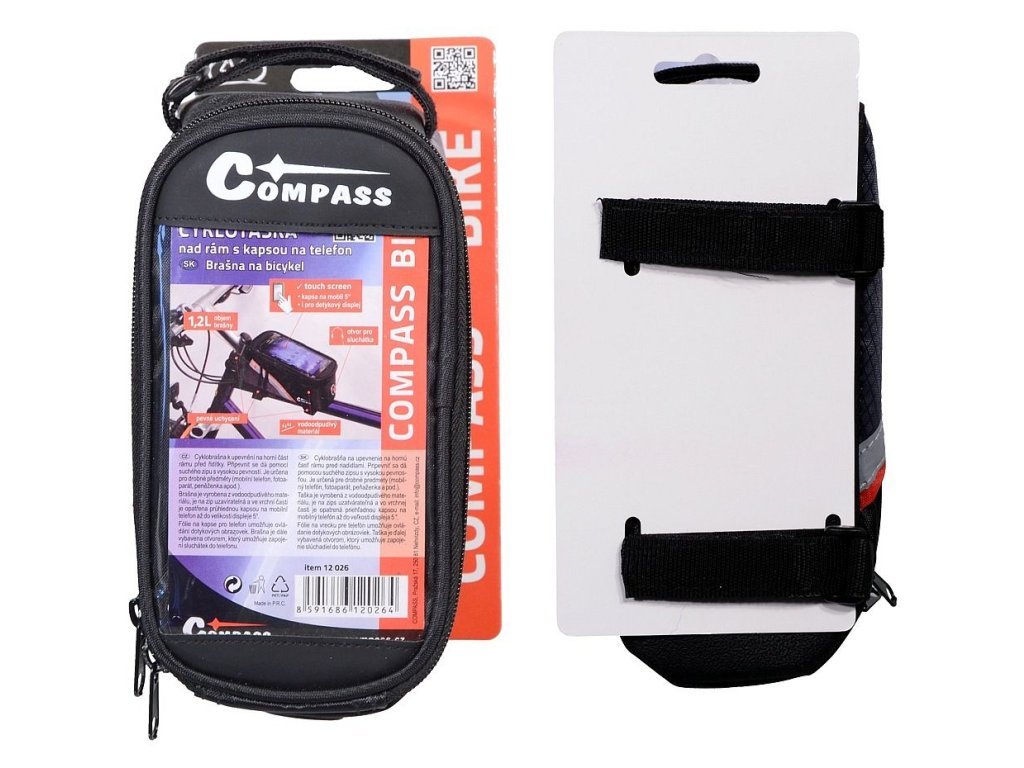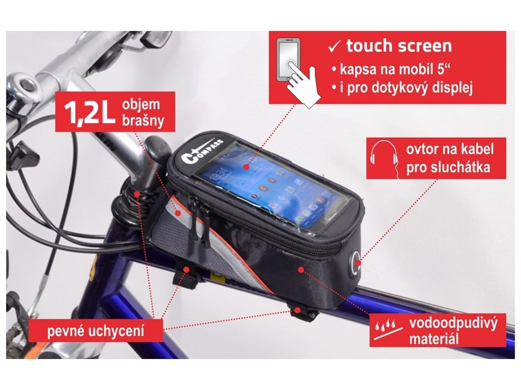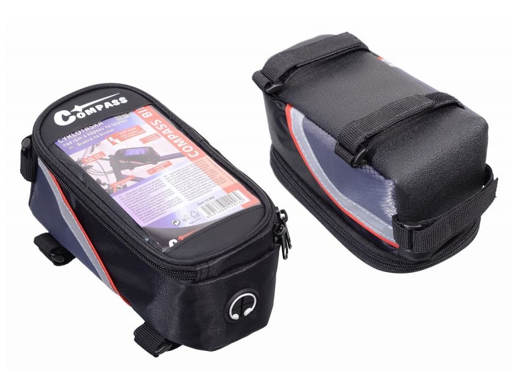 Cyklobrašna k upevnění na horní část rámu před řidítky. Připevnit se dá pomocí suchého zipu s vysokou pevností. Je určena pro drobné předměty (mobilní telefon, fotoaparát, peněženka apod.). Brašna je vyrobena z vodoodpudivého materiálu, je na zip uzavíratelná a ve vrchní časti je opatřena průhlednou kapsou na mobilní telefon až do velikosti displeje 5“. Fólie na kapse pro telefon umožňuje ovládání dotykových obrazovek. Brašna je dále vybavena otvorem, který umožňuje zapojení sluchátek do telefonu.