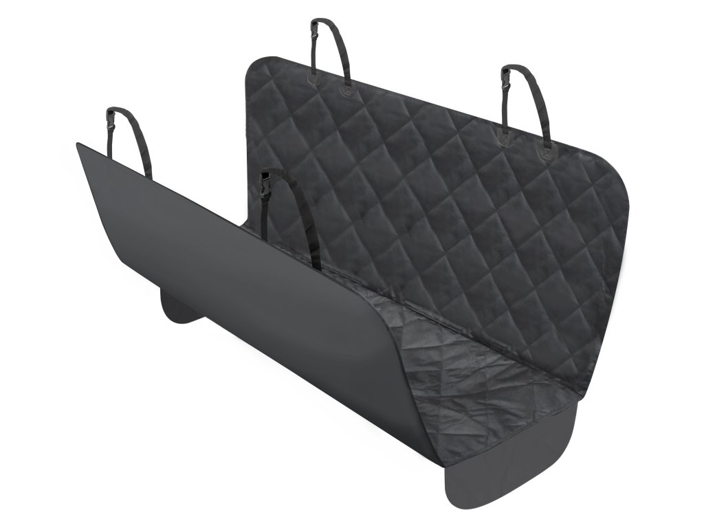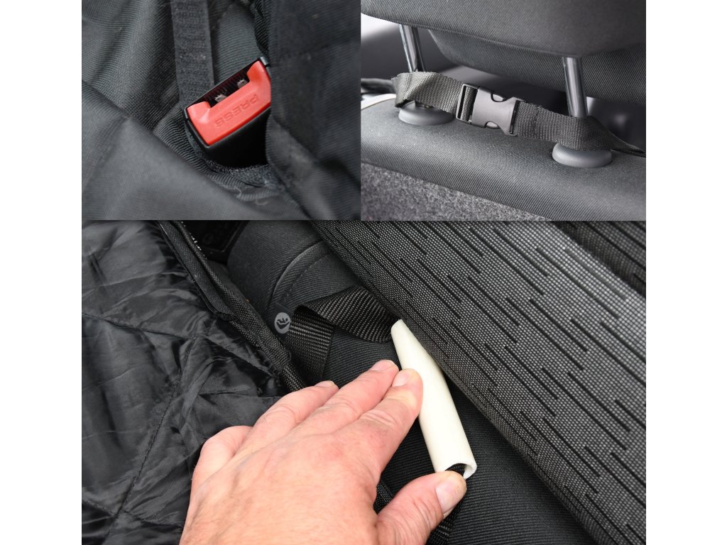 Prošívaný, vícevrstvý materiál zajišťuje pohodlné cestování psa. Deka ochrání i zadní stranu předních sedadel, a navíc i boční strany sedadel, díky uším na bocích. Deka je opatřena otvory pro bezpečnostní pásy, uzavíratelné na suchý zip.