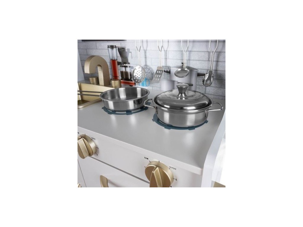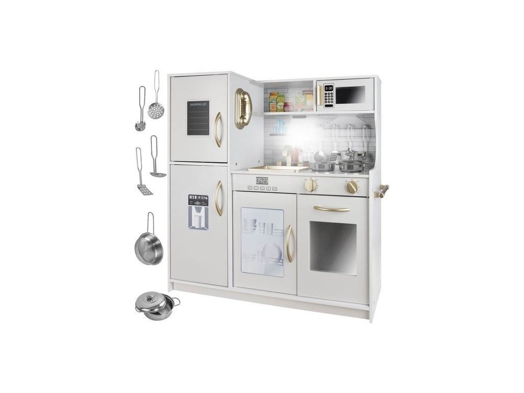 Dětská dřevěná kuchyňka s příslušenstvím XXL bílá, Kruzzel Děti jsou přirozeně zvědavé na svět a rády napodobují ostatní. Učí se pozorováním a hrou. Dřevěná kuchyňka je fantastický způsob, jak trávit čas atraktivním způsobem pro děti, které si rády hrají na domečky a připravují jídla. Umožní vám hrát role již od útlého věku a bude mít výchovnou funkci. Tento produkt je skvělým nápadem, jak zahnat nudu, zvláště když je venku špatné počasí.Dřevěná kuchyňka na hračky má módní, moderní vzhled, který ocení každý rostoucí kuchař. Má imitaci dvou hořáků, na kterých můžete vařit chutné pokrmy. Po otočení knoflíků uslyšíte charakteristické cvaknutí. Po dokončení jídla musíte ještě umýt nádobí pomocí dřezu.