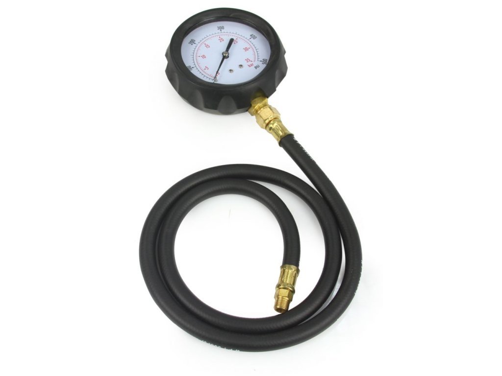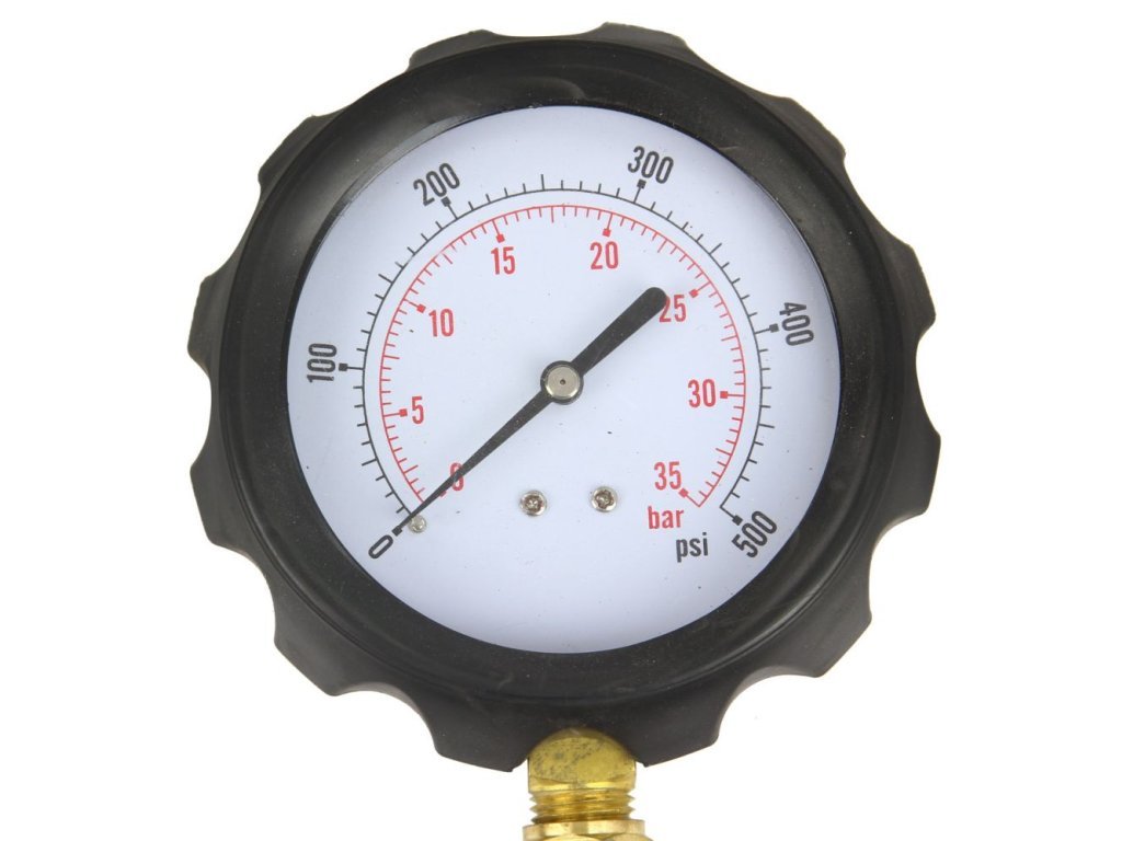 - Tlakoměr 0-35 bar o průměru 63 mm s vysokotlakou pryžovou hadicí a koncovkou (1/8" NPT) pro připojení 11 adaptérů (1/4" NTP a 3/8" NTP).