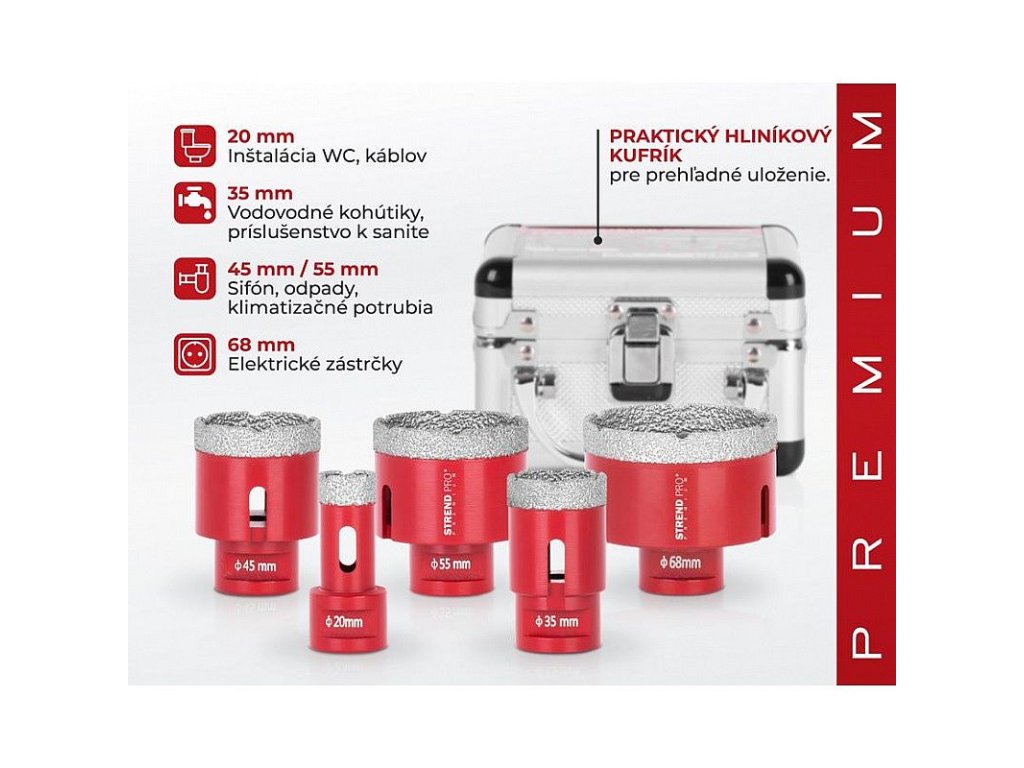 Sada diamantových korunek Premium je vhodná pro vyřezávání všech druhů tvrzeného kamene a jeho sloučenin, keramických dlaždic, mramoru, gresu, porcelánu a žuly.