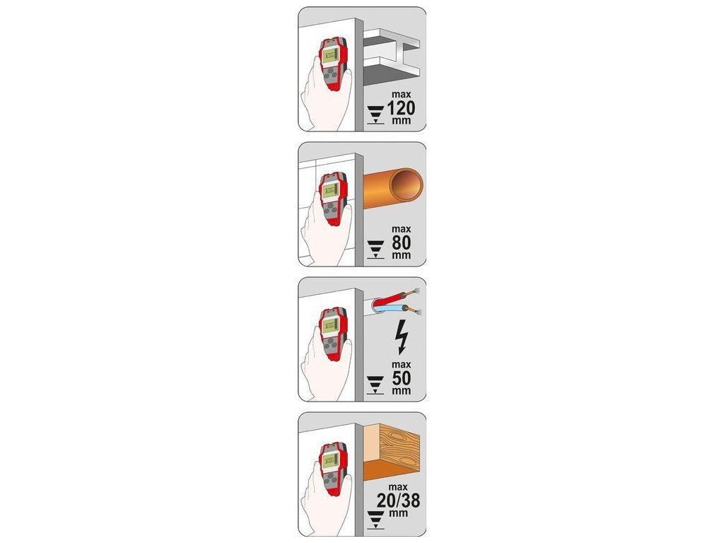 Použití detektoru YATO YT-73138 a metru 4v1 výrazně urychluje práci, zvyšuje bezpečnost a minimalizuje riziko náhodného poškození elektrické nebo hydraulické instalace umístěné pod omítkou. Díky ní můžete mj bezpečně vyvrtejte díru nebo najděte místo pro zašroubování šroubu do dřevěného nebo kovového profilu skrytého pod sádrokartonem. Vestavěný vlhkoměr umožní mj zjišťování úrovně vlhkosti omítky v tepelných mostech a také kontrola vlhkosti u dřeva určeného jako palivo.