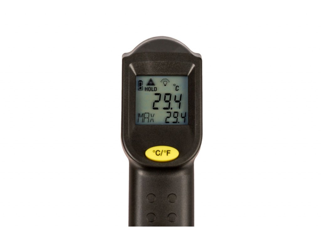 Díky laserovému ukazovátku naměříte požadovanou hodnotu v potřebném bodě. Naměřené hodnoty se zobrazují na modře podsvíceném displeji , který je dobře čitelný i na méně osvícených místech. Požadovanou hodnotu v 90% uvidíte na displeji po stisku spouště na dobu min. 1 vteřiny. Tyto vlastnosti Vám dopomůžou co nejpřesněji určit a změřit potřebnou hodnotu a to standardně ve stupních Celsia nebo Fahrenheita °C / °F.