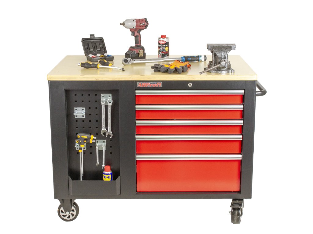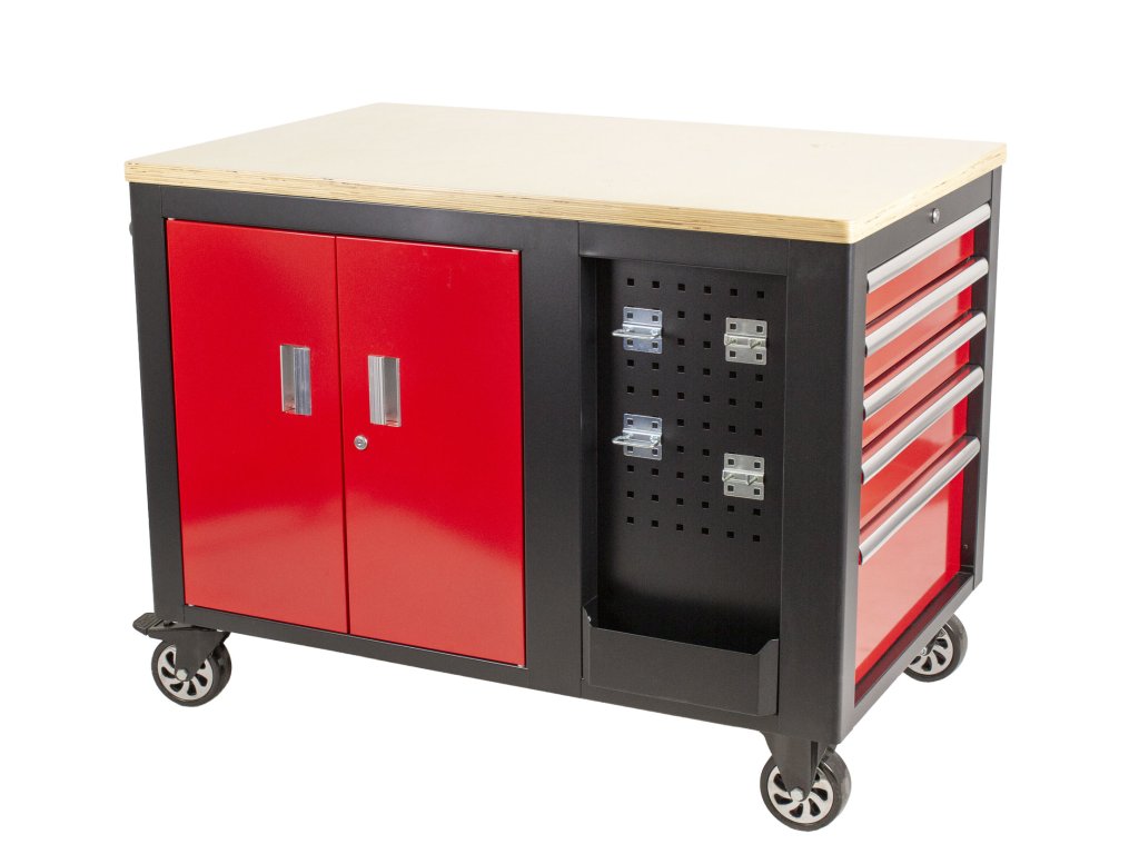Na širších stranách vozíků jsou 2x děrované desky s přihrádkou, z jedné strany 5 zásuvek a z druhé dvoukřídlá skříňka se 2-mi poličkami. Na užších stranách se nachází dalších 5 zásuvek a madlo pro snadné manipulování s dílenských vozíkem.