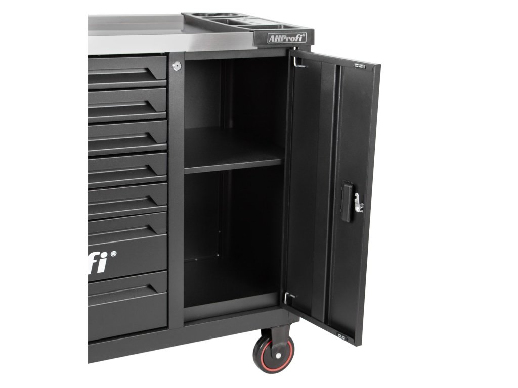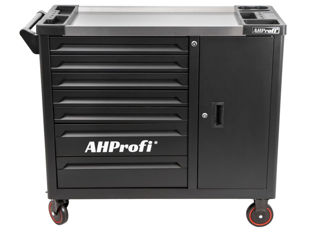Široká konstrukce vozíku s množstvím úložného prostoru s celkem 7 zásuvkami a skříňkou, umožnuje dokonalý přehled nad nářadím.