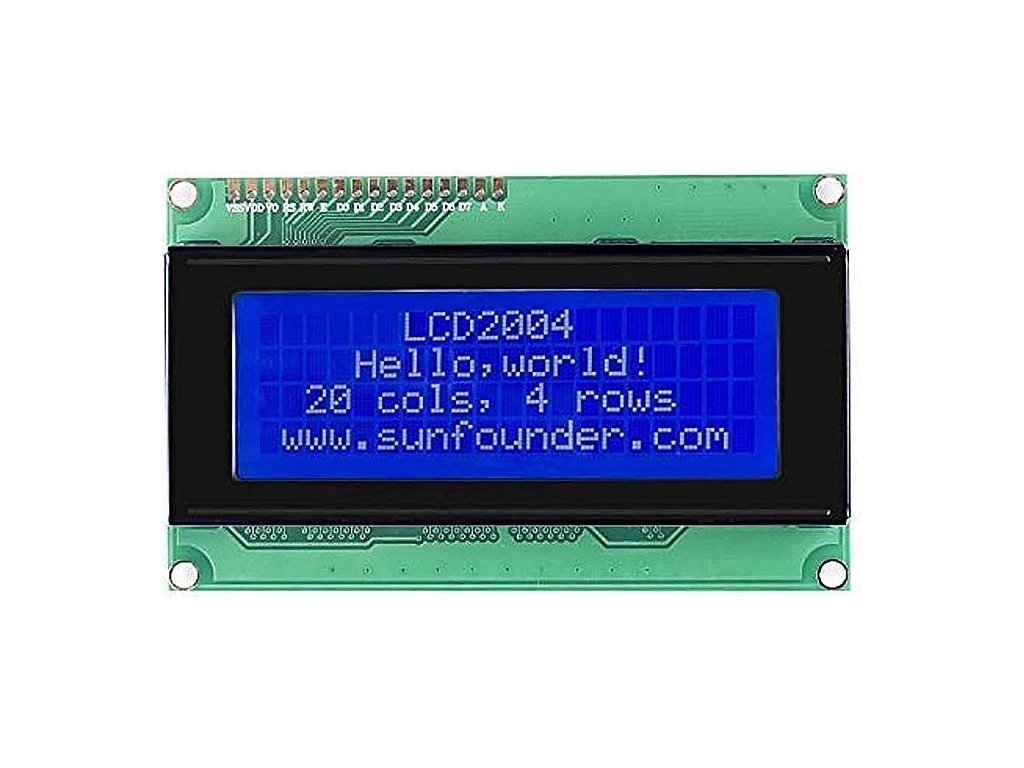 Jedná se o základní LCD displej - 20 znaků a 4 řádky, modře podsvícený, bílá písmena. Využívá extrémně jednoduchý HD44780 řadič paralelního rozhraní. <BR/><BR/>**Specifikace:** <BR/>Rozlišení: 4-řádky x 20-znaků<BR/>Napájení: 5V<BR/>Rozměry modulu: 98x60x12mm<BR/>Rozhraní: I2C<BR/>I2C adresa: 0x27,0x3F (adresa se může lišit a nemůže být změněna)<BR/>Driver IC: HD44780 <BR/>Proměr montážních otvorů: 3,5mm<BR/>Rozteč montážních otvorů: 93,1x55mmDoplňkové parametry
