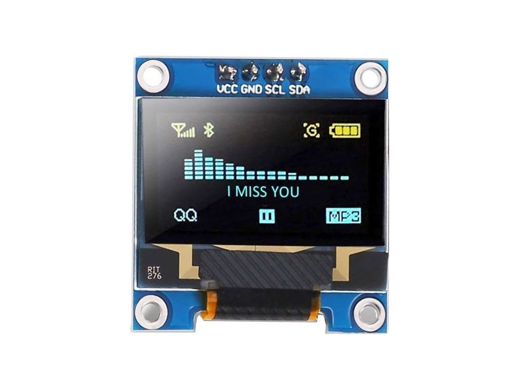 OLED displej 0,96” s modrožlutými znaky a sběrnicí I2C. Piny GND, VCC, SCL, SDA<BR/>**Specifikace:** <BR/>Sběrnice IIC I2C <BR/>Úhlopříčka 0,96” <BR/>Rozlišení 128 x 64pix <BR/>Modře a žlutě svítící body OLED <BR/>Příkon 40mW <BR/>Napájení 3,3 - 5V DC <BR/>Provozní teplota -30 až +80°C <BR/>Rozměry modulu 27 x 27 x 4,1mm <BR/>Driver: SSD1306Doplňkové parametry