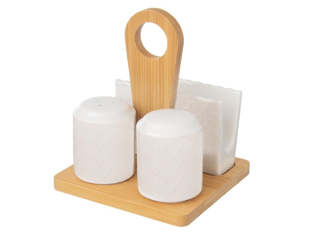 Dochucovací souprava na podnosu.Sůl a pepř budete mít po ruce při vaření i při stolování, stojánek uloží zásobu ubrousků.