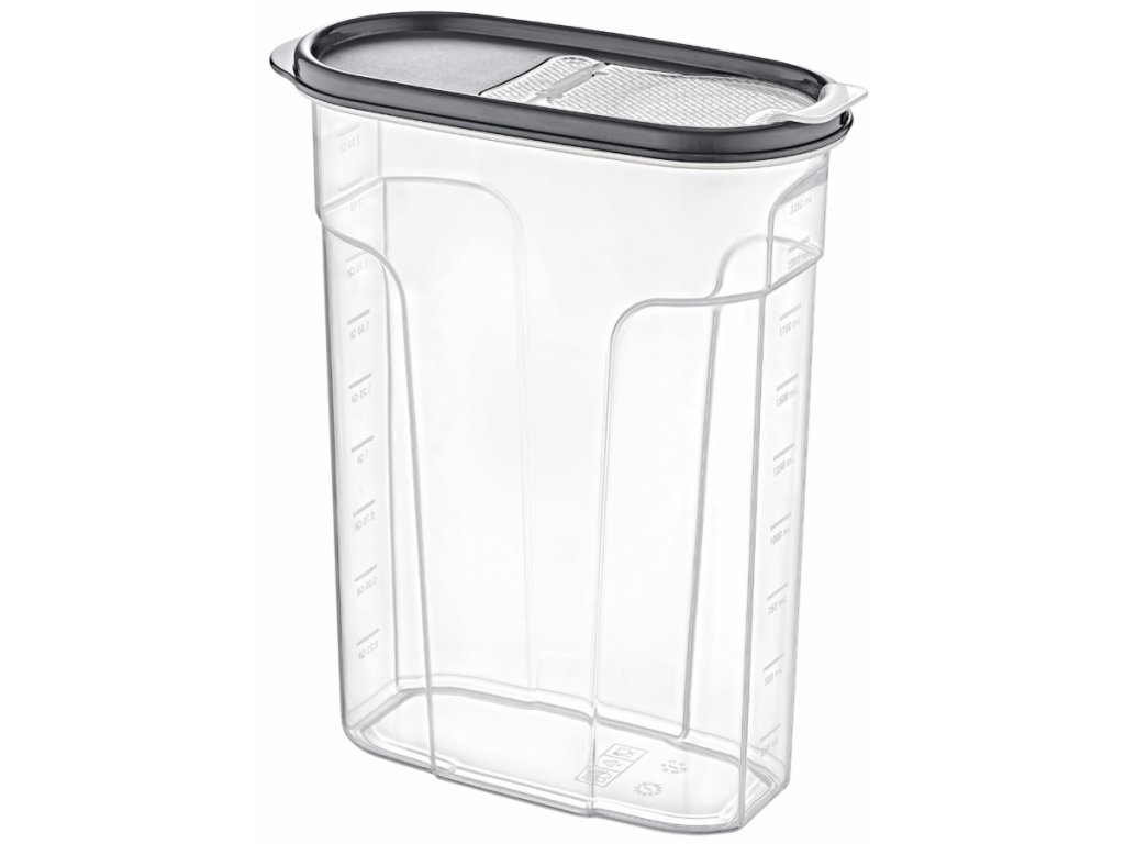 Transparentní plastová dóza s barevným víkem o objemu 2.4 litru.Dóza je praktickým pomocníkem na ukládání těstovin, luštěnin, mouky a jiných potravin.
