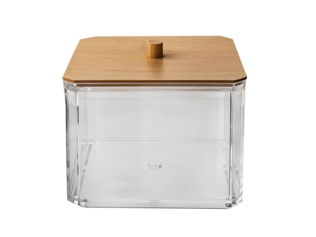 Transparentní plastová dóza na vatové tampony s bambusovým víkem.Rozměry 9.5 x 9.5 a výška 8 cm.
