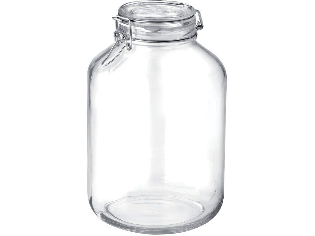 Průměr 17.5 a výška 27.5 cm, objem 5 litrů.Skleněná dóza s patentním uzávěrem a těsněním pod víkem.