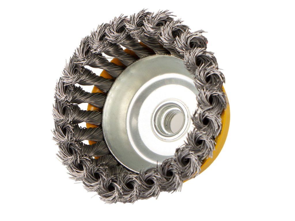 Drátěný čelní kartáč o průměru 100 mm pro odstraňování rzi, barev a laků z kovových předmětů.