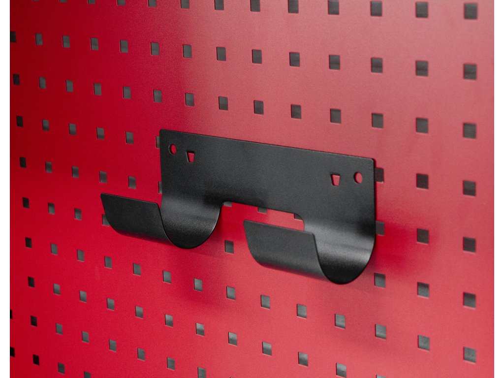 Držák AKU nářadí je určen pro děrované desky s roztečí 38 x 38 mm. Připevněním na perforovaný panel lze rozšířit úložný prostor také pro sestavy dílenského nábytku, dílenské vozíky s nářadím i bez nářadí, pracovní stoly i policové regály.