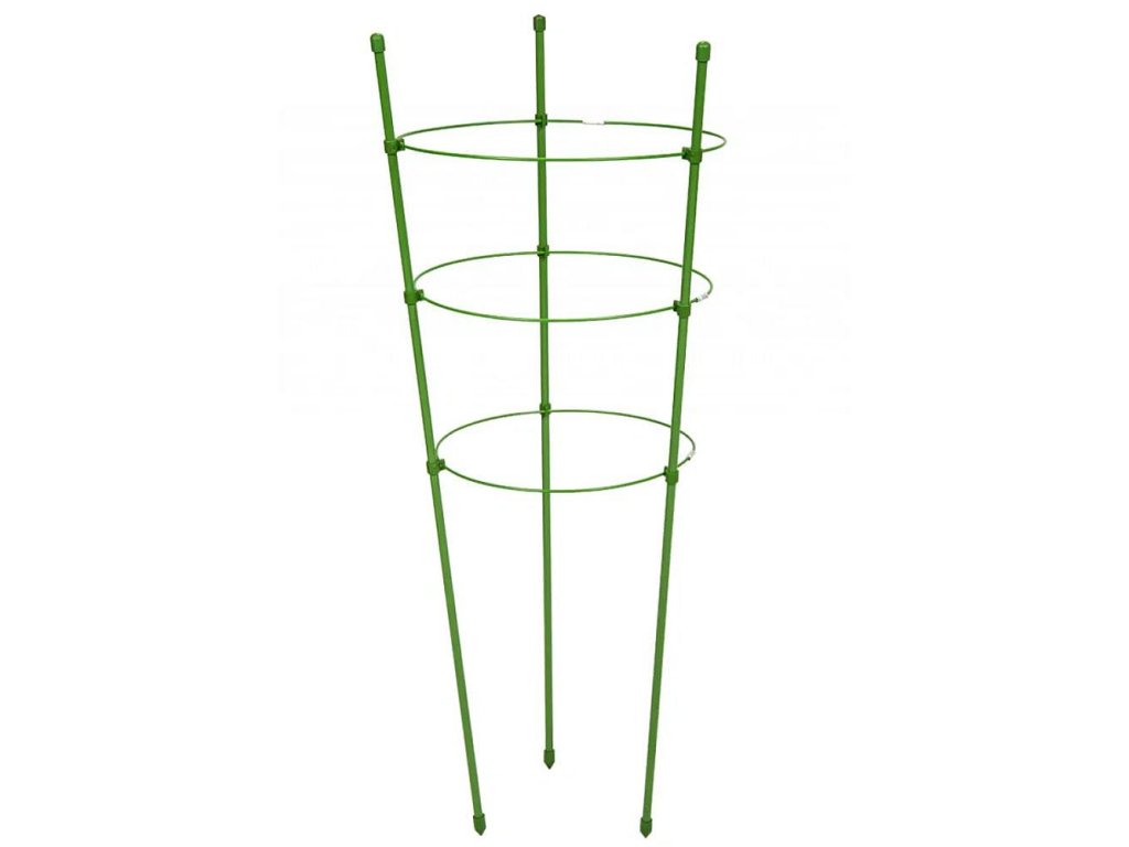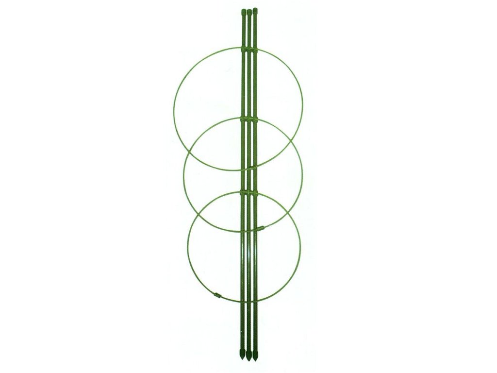 Držák obsahuje tři tyče a tři kruhy v různé výšce připevněné na tyčích.
