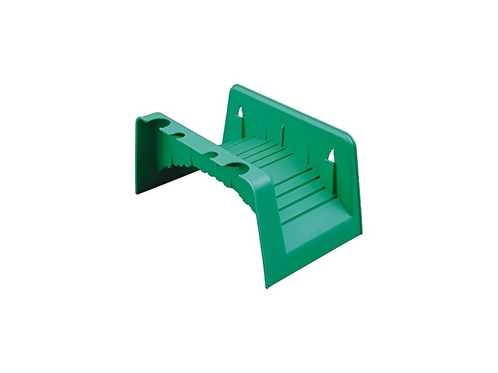 Držák obsahuje odkládací prostory na koncovky, stříkací pistole a jiné.Plastový držák zelené barvy je určený k namontování na stěnu.