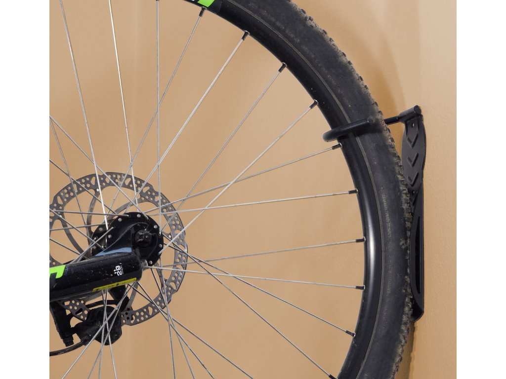 Držák je vybaven hákem pro zavěšení předního kola a vodící deskou, díky které kolo neznečistí zeď a zároveň zabraňuje výraznému naklánění kola do stran.