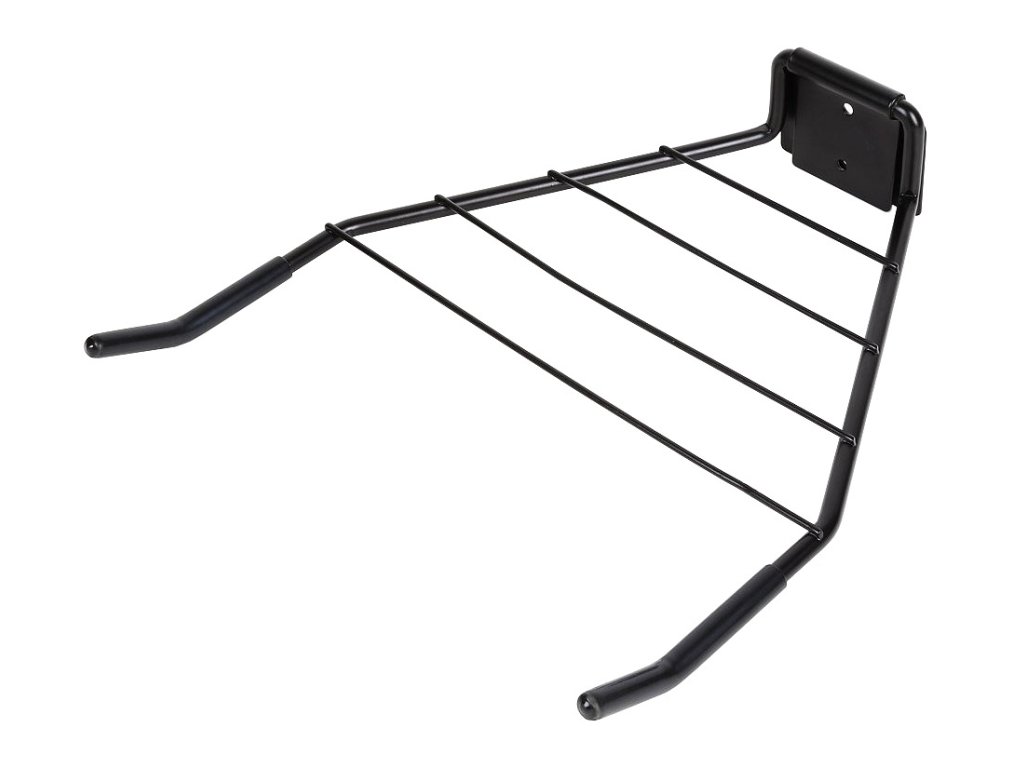 Sklápěcí držák jízdního kola s mřížkou pro příslušenství, určený k montáži na stěnu.