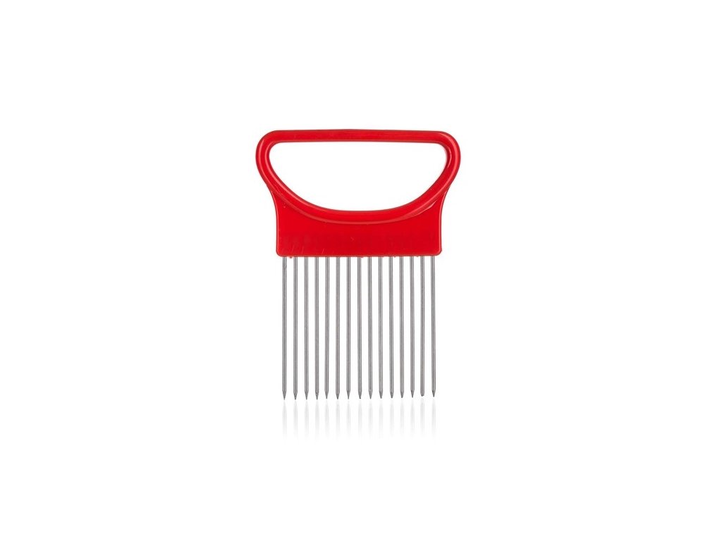 Hřebenový držák na krájení cibule, drátový hřebínek v plastové rukojeti.Délka 10.7 a šířka 7.8 cm.