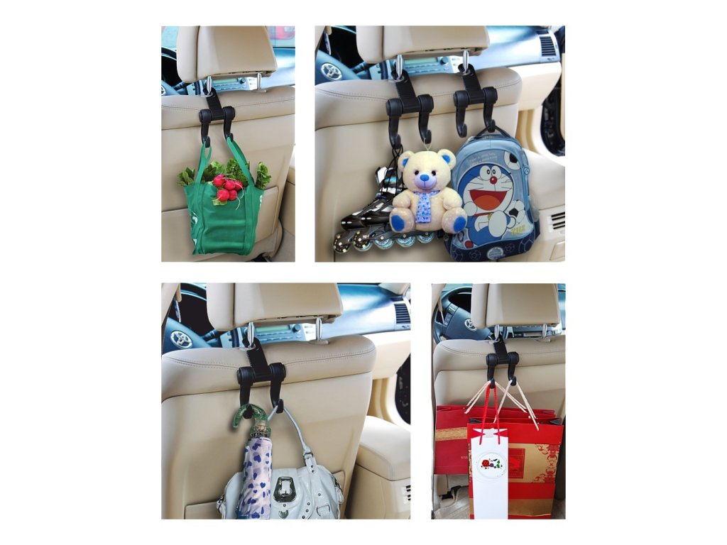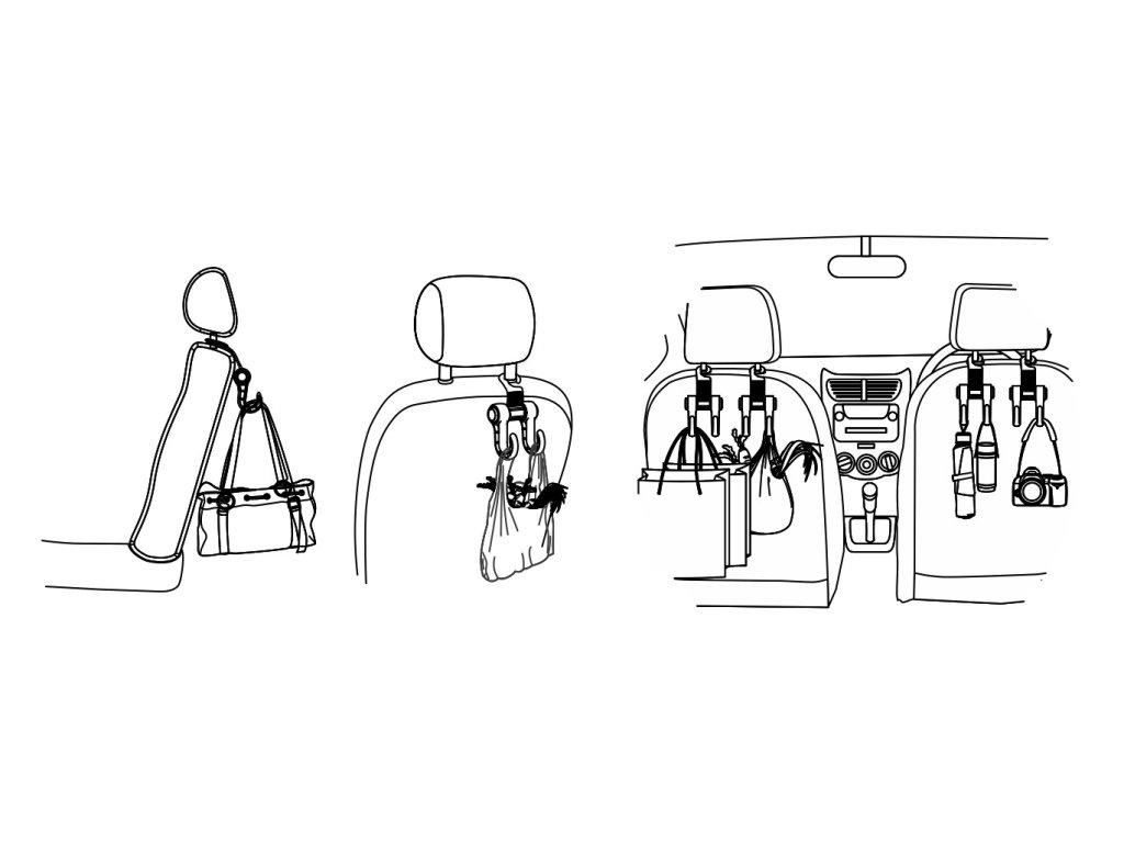 Praktický držák k zavěšení na opěrku hlavy předních sedadel automobilu.