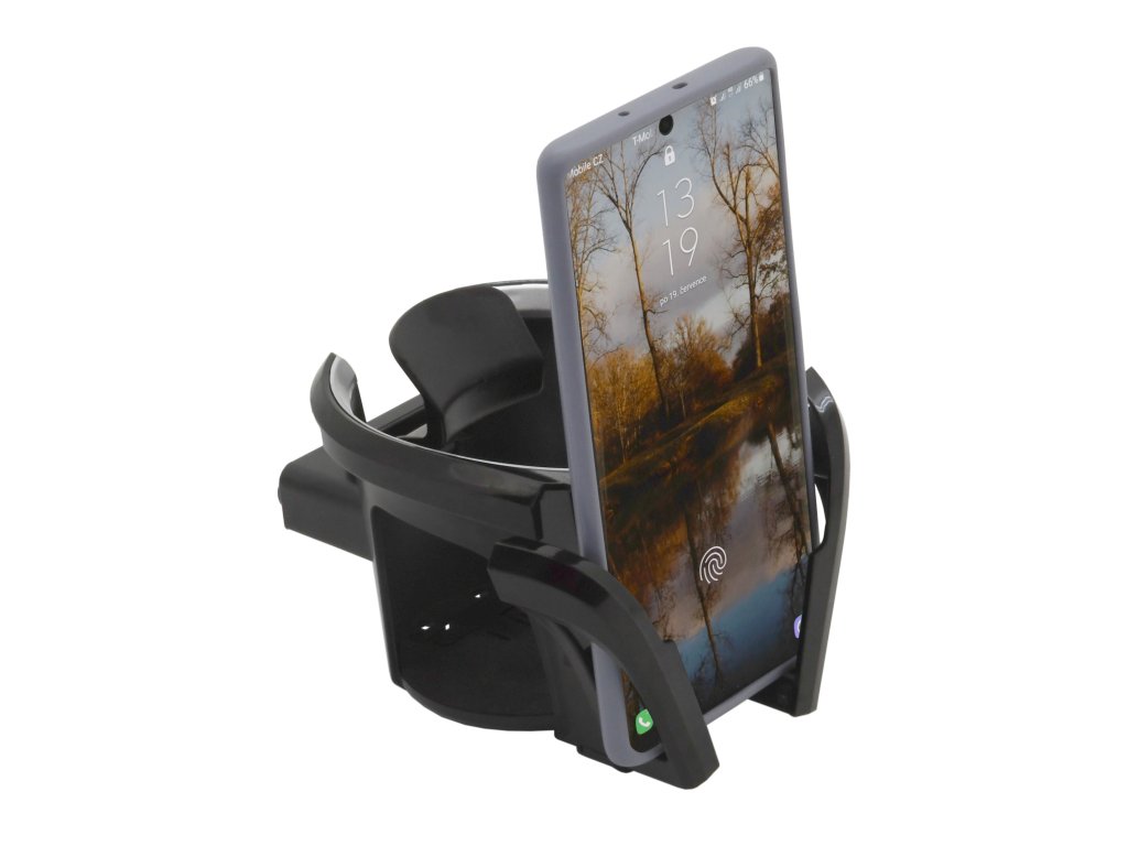 Držák je vhodný pro umístění telefonu se šířkou 50-80 mm a součaně pro umístění nápoje do objemu 0,5l (plechovky, petlahve, případně kelímek). Telefon lze jednoduše do držáku vložit jednou rukou a i přesto je zabezpečen před nechtěným pohybem pomocí pružinového systému. Nápoje jsou rovněž zajištěny před volným pohybem a vylitím.