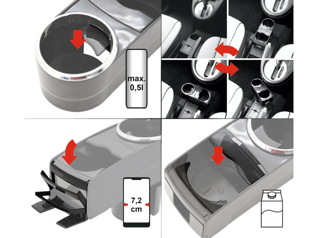 Držák je vhodný pro umístění telefonu se šířkou max 7,2 cm a lze jej do držáku jednoduše vložit jednou rukou. Držák je vhodný i pro umístění 2x nápojů do objemu 0,5l (plechovky, petlahve, případně šálky) z nichž do jednoho držáku je možné umístit i krabicové balení s max. rozměry 7,5 x 7,5 cm. Nápoje jsou zajištěny před volným pohybem a vylitím.