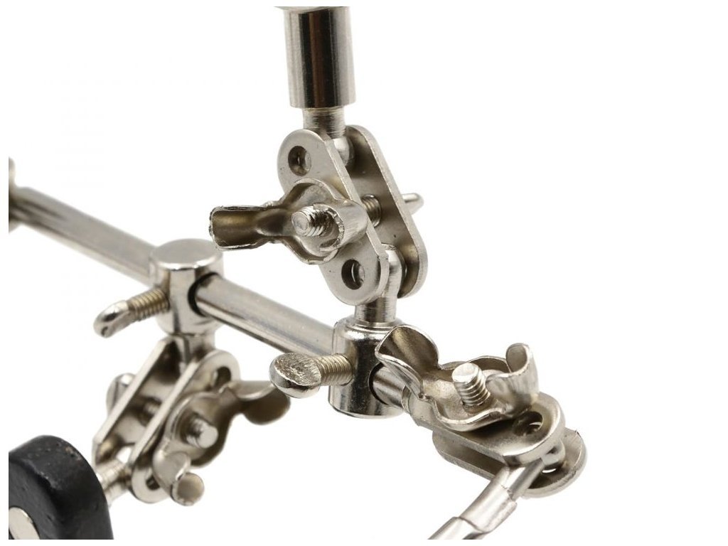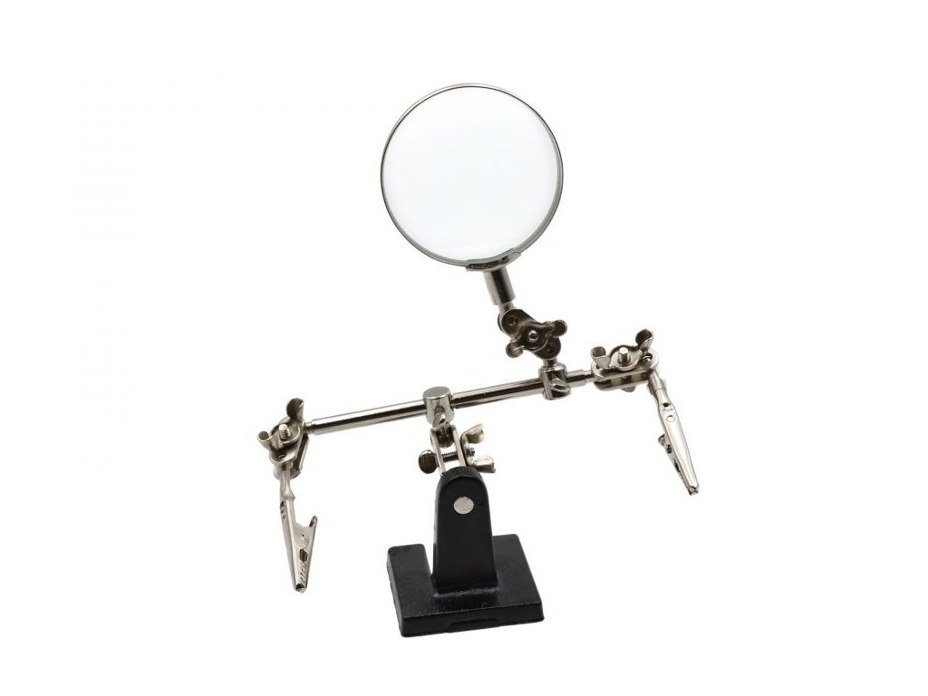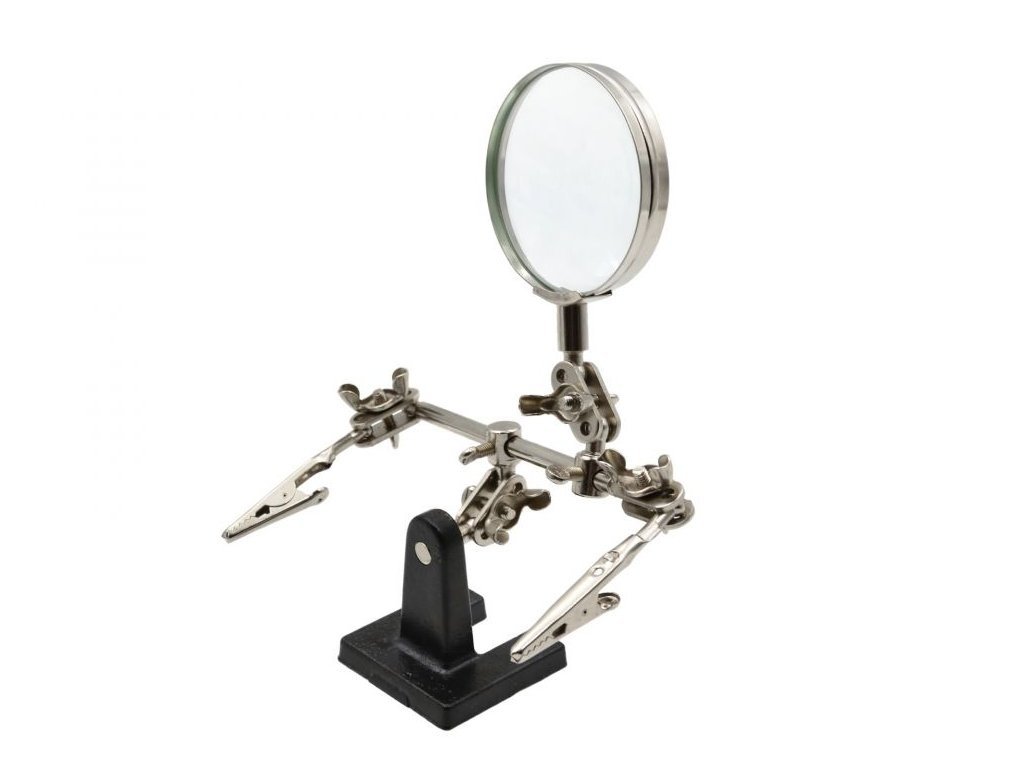 Při některých pracích si člověk říká, že by potřeboval mít ještě třetí ruku. Nic není nemožné. Představujeme Vám tento šikovný držák s lupou - třetí ruka. Tuto praktickou vychytávku uvítají především ti, kteří se věnují elektronickým a elektrotechnickým pracím. Souprava obsahuje lupu, stativ a držák, neboli třetí ruku. Díky lupě uvidíte i na ty nejmenší součástky a pomocí držáku si můžete přidržet další předměty. Držet lupu, opravovat a zároveň ještě přidržovat předmět může být obtížné. Díky této třetí ruce bude každá práce snadnější. Pokud opravujete například hodinky, šperky či jiné předměty, tuto věcičku uvítáte. Držák s lupou - třetí ruka je originální dárek pro usnadnění práce.