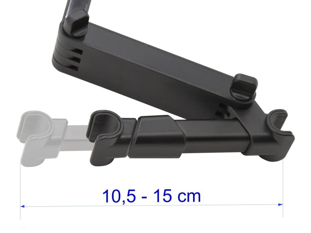 Díky široké škále nastavení úhlů zle nastavit prakticky libovolnou polohu. Držák je navíc opatřen vysouvacím ramenem, díky kterému lze uchytiti ke každé opěrce sedadla.