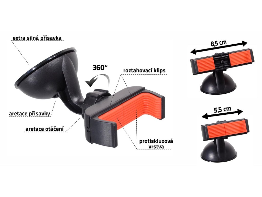 Držák telefonu s extra silnou přísavkou a klipsem pro uchycení telefonu šířky 5,5 – 8,5 cm.