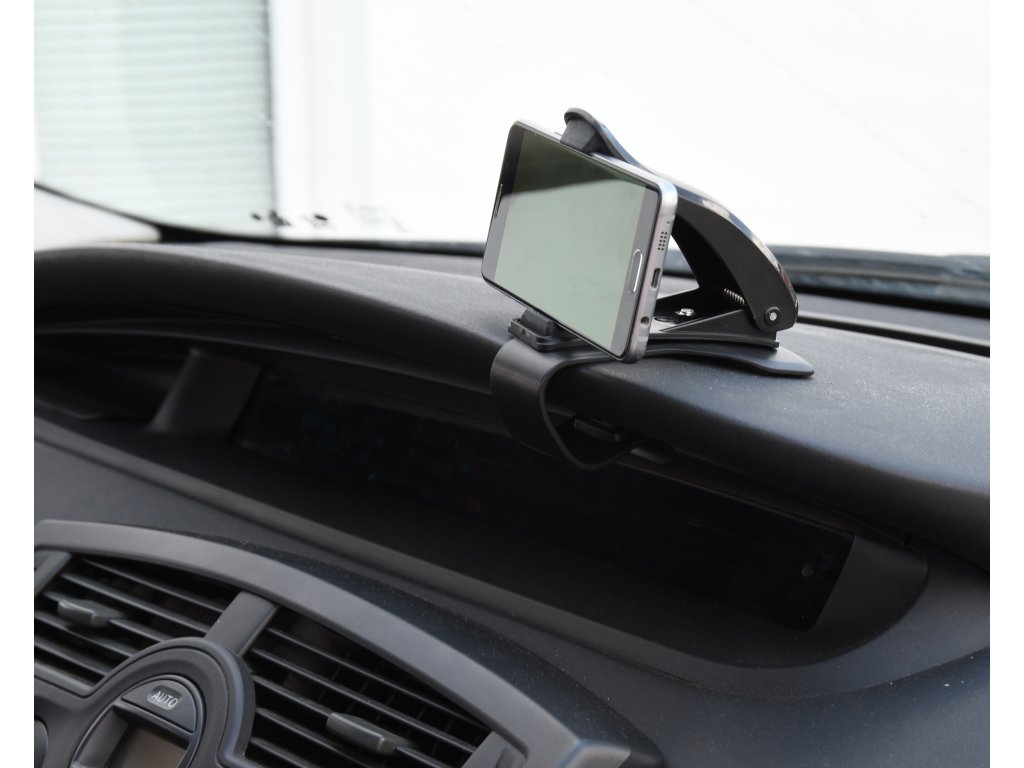 Držák je možné nasunout na výstupek palubní desky, nebo např. na hranu stolu či poličky.