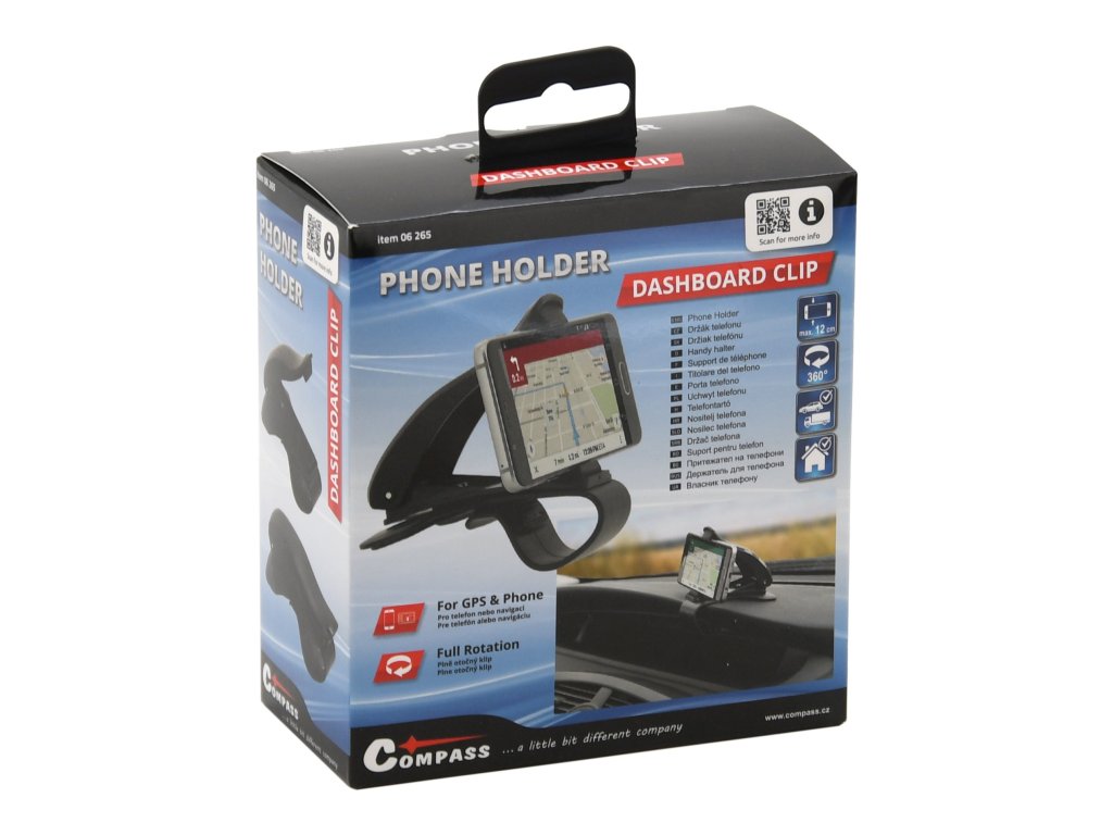 Držák telefonu nebo navigace s klipem, který umožňuje upevnění na vhodnou hranu.