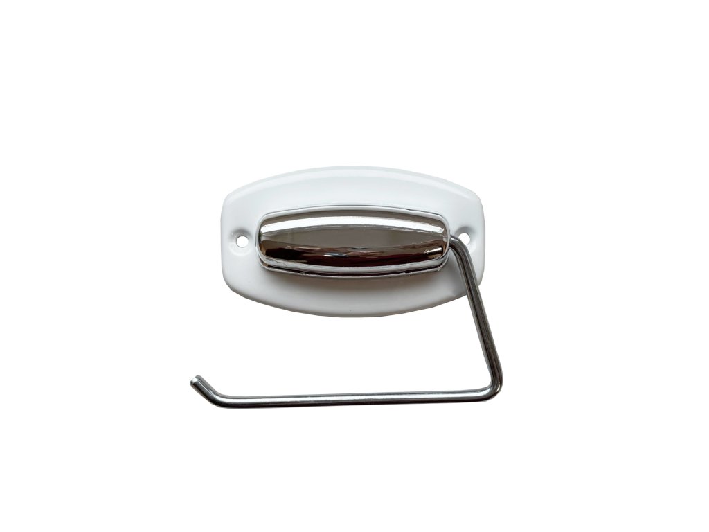 Chromovaný držák toaletního papíru, bílá komaxitová základna.Určeno k přišroubování na stěnu.