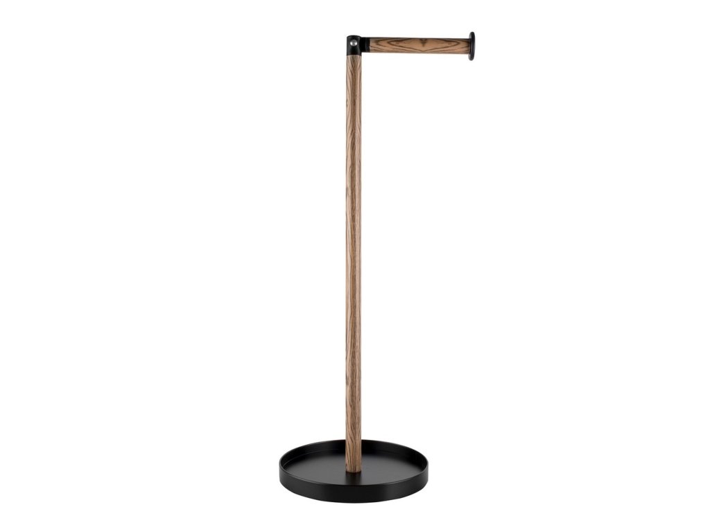 Elegantní kovový lakovaný držák toaletního papíru stojanového typu.Držák je kombinovaný se zásobníkem na toaletní papír.