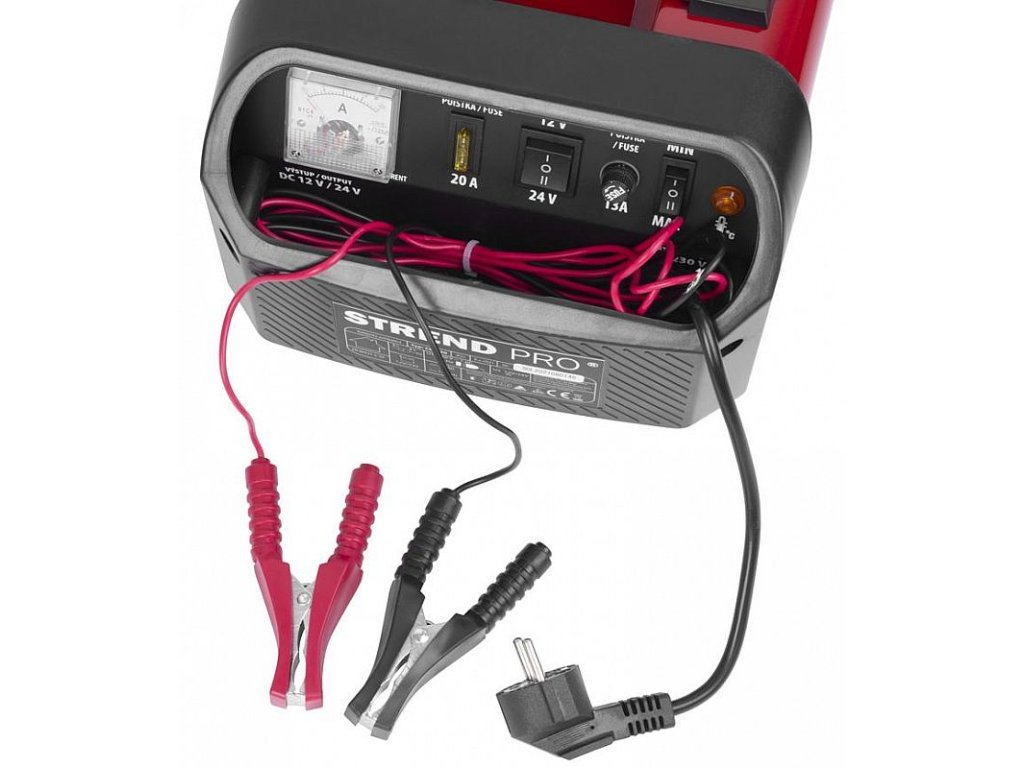 Je vybavena přepínačem pomalého a rychlého nabíjení, přepínačem napětí 12V / 24V a dvěma pojistkami.