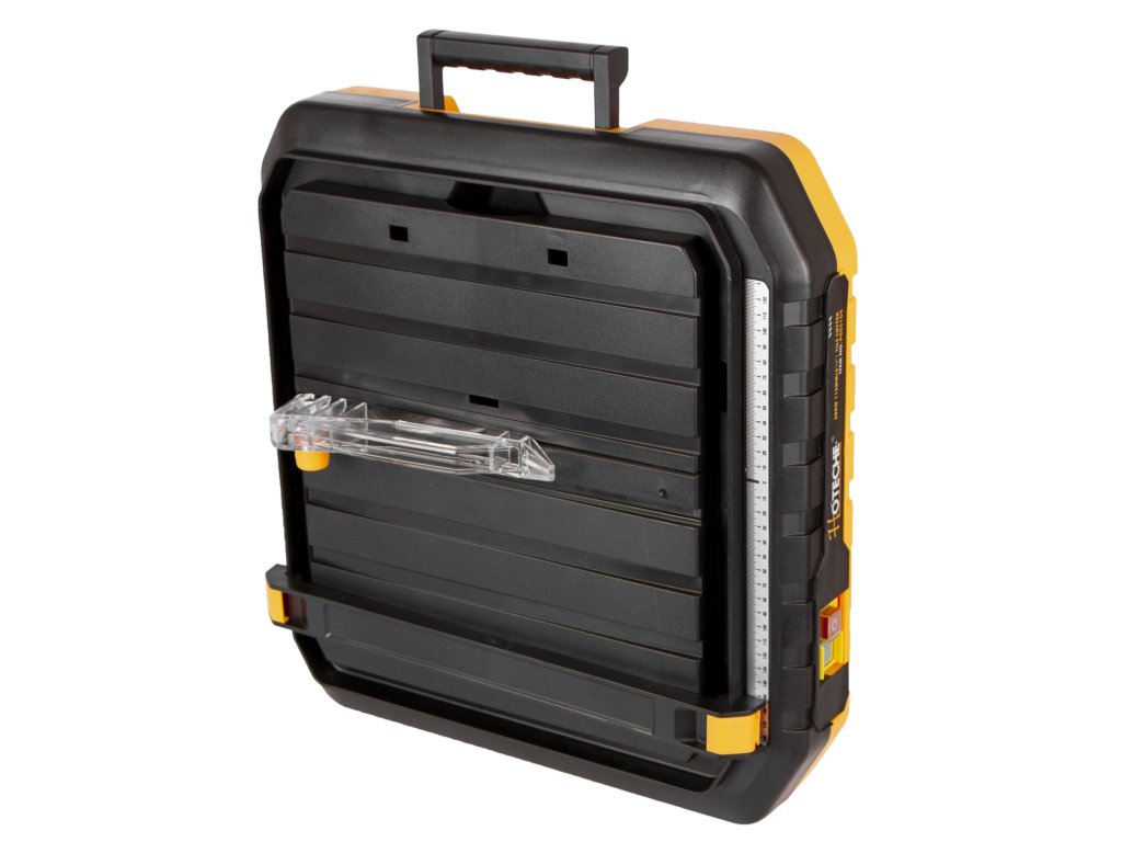 Na přední straně se nachází stupnice sposuvným pravítkem pro snadné měření. Pravítko je dále také opatřeno aretací pro šikmé řezání.