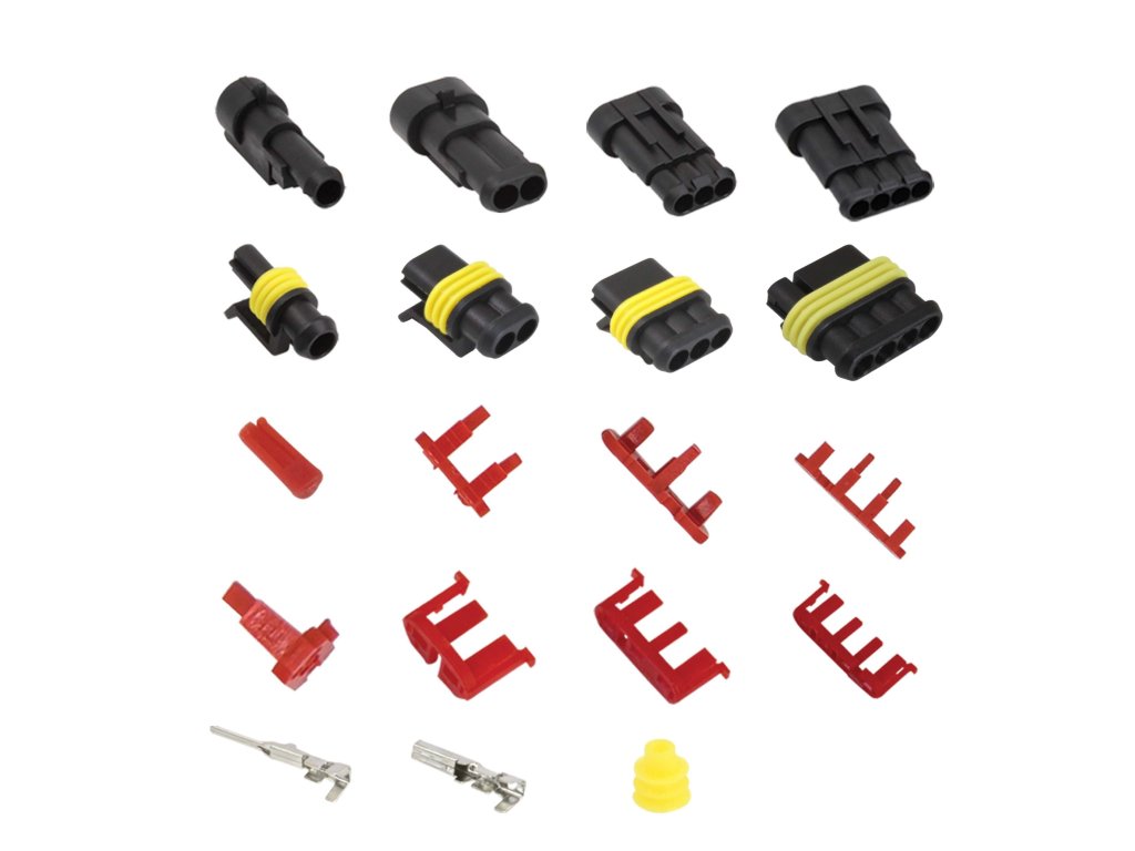 Prakticky poskládaná souprava konektorů s různým počtem kontaktů pro propojení drátů a tenčích kabelů v elektrických soustavách aut, autobusů, traktorů a dalších vozidel.