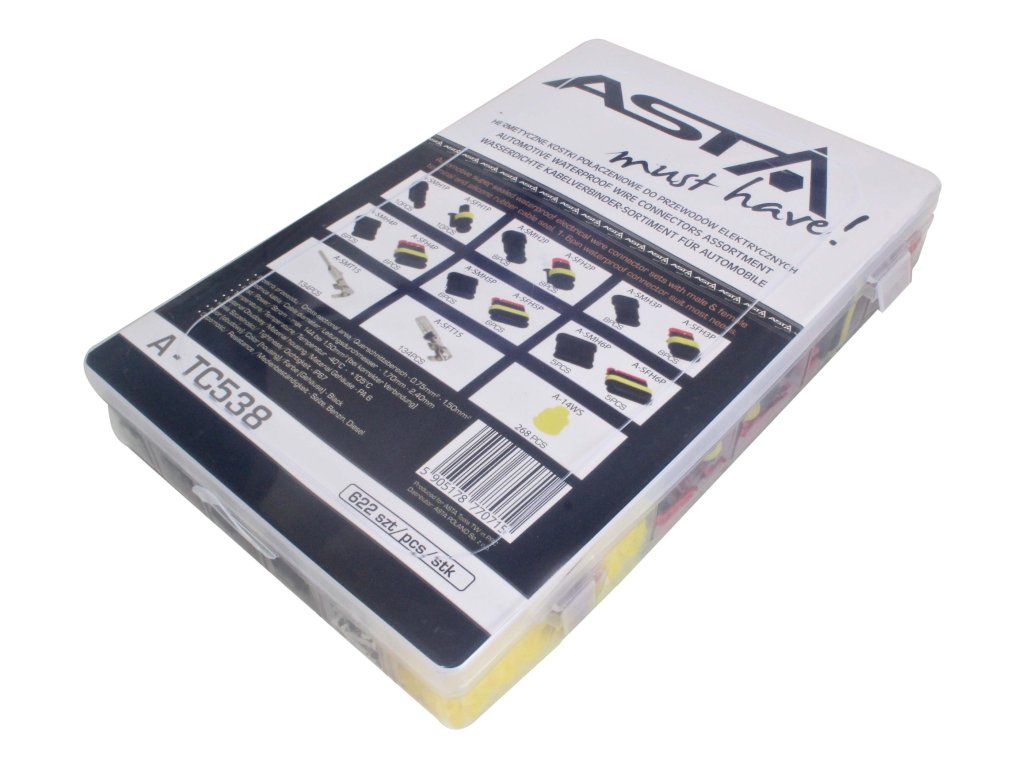 Sada samčích a zásuvkových 1-, 2-, 3-, 4-, 5- a 6pinových krimpovacích konektorů určených pro připojení vnitřní kabeláže o průměru až 2,4 mm – ASTA A-TC538