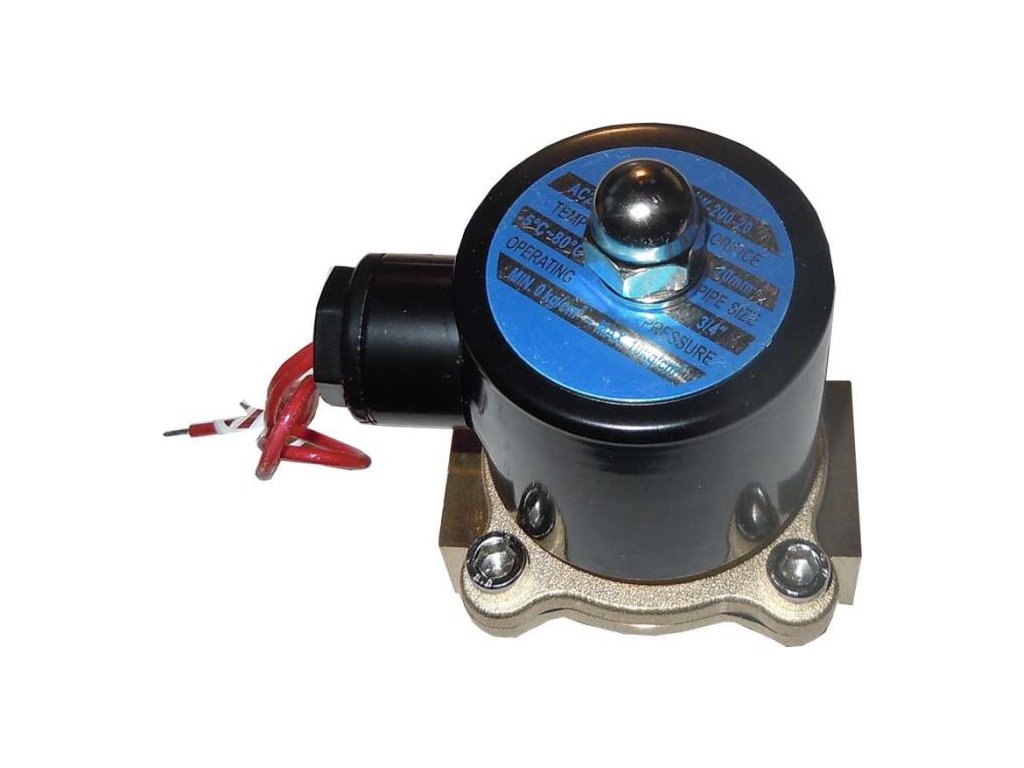 Elektromagnetický ventil 2W-200-20, 230VAC, mosazný, příruby G3/4”, NC Mosazný ventil na vodu nebo vzduch s přírubami 3/4” pracující i při nulovém tlaku protékající kapaliny.**Specifikace:**
