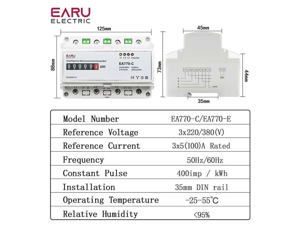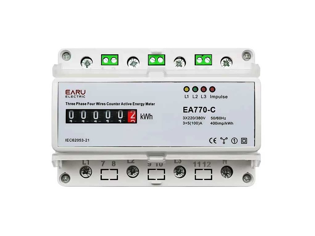 Elektroměr EA770-C 3 fázový analogový na DIN lištu Elektroměr ke kontinuálnímu měření činné spotřeby elektrické energie z třífázového zdroje. Měří spotřebu i přetoky ve stejném poměru, přetoky registruje jako spotřebu.**Technické parametry:**