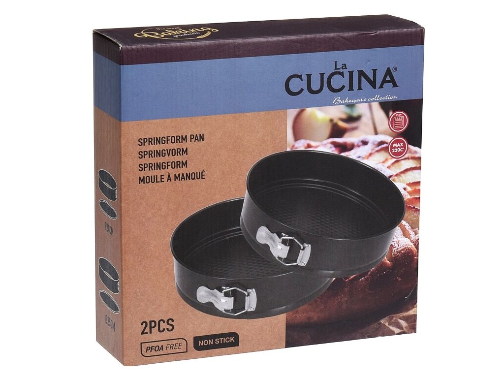 - sada dvou různě velkých forem na dort- uhlíková ocel s nepřilnavým povrchem- oblíbený systém uzavírání na klips- žáruvzdorné do teploty 220°C- vhodné do myčky nádobí- sada obsahuje 2 formy o průměrech 24 a 26 cm- výška: 6.8 cm- ECOfriendly: neobsahuje olovo, PFOA ani kadmiumDoplňkové parametry