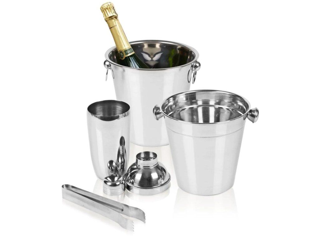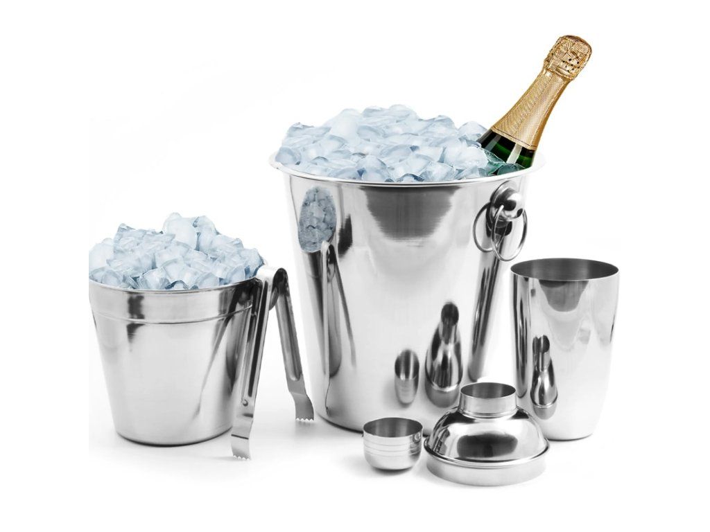 - bohatě vybavený barmanský party set 4 ks- materiál: nerezová ocel- lesklý vnější povrch- matný nerezový vnitřní povrch- sada 4 ks obsahuje:- kbelík na led 14 x 14 cm- chladič na víno/šampaňské 20 x 21 cm- barmanský shaker 500 ml- kleště na led 12 cm- barva: stříbrnáDoplňkové parametry