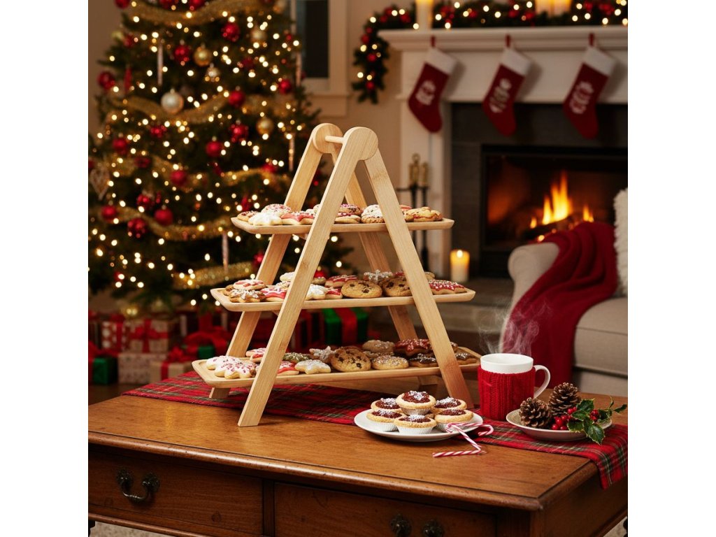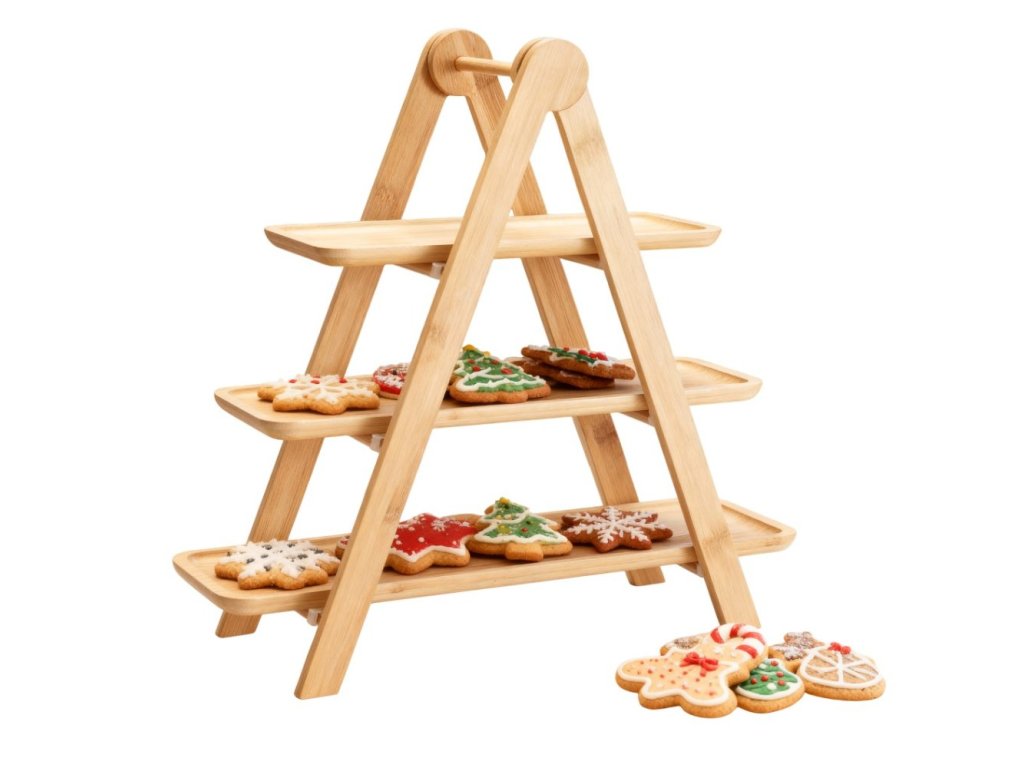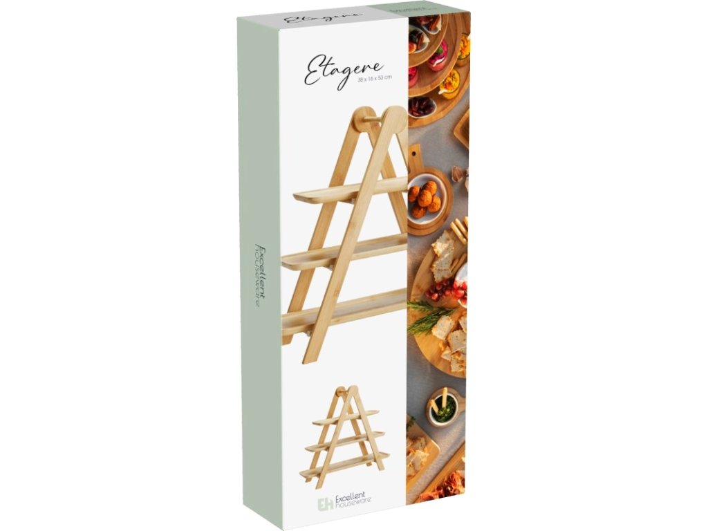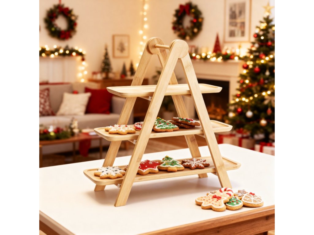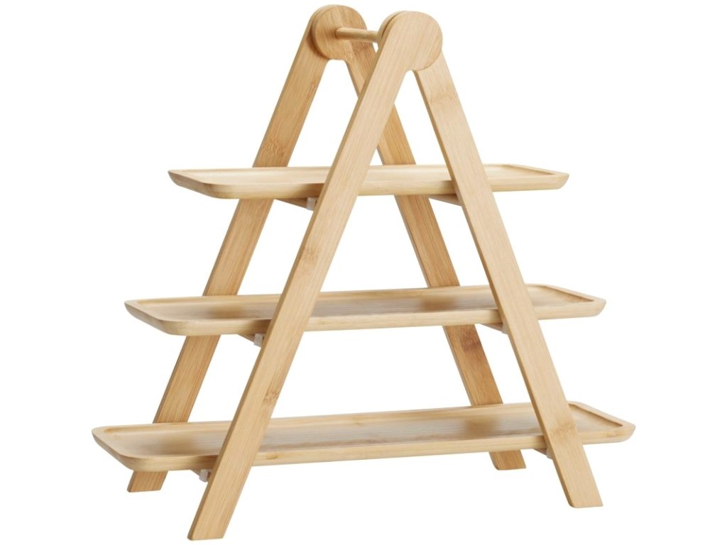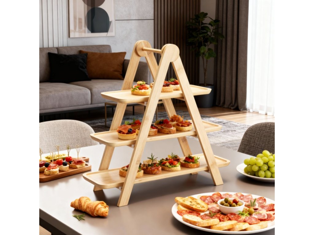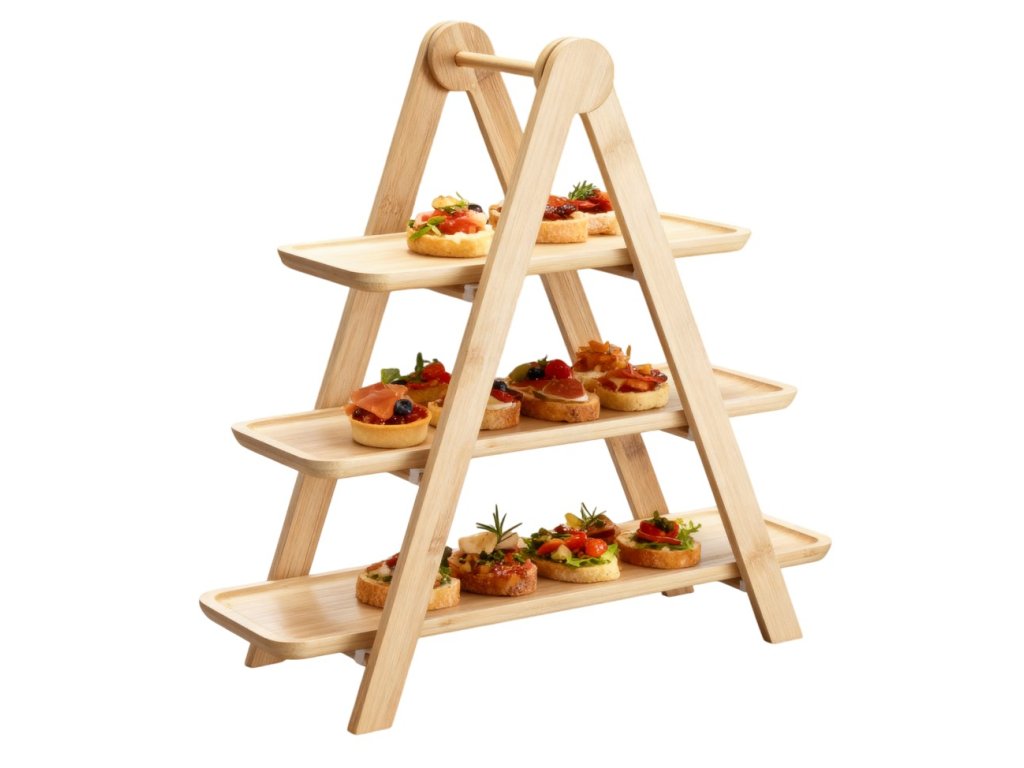 Elegantní třípatrový etažér na servírování, vyrobený z kvalitního bambusu s pevnými PV klipy. Ideální pro podávání dezertů, ovoce, sýrů či slaných pochoutek. Díky přírodnímu provedení a stabilní konstrukci se hodí jak pro každodenní stolování, tak pro slavnostní příležitosti.
