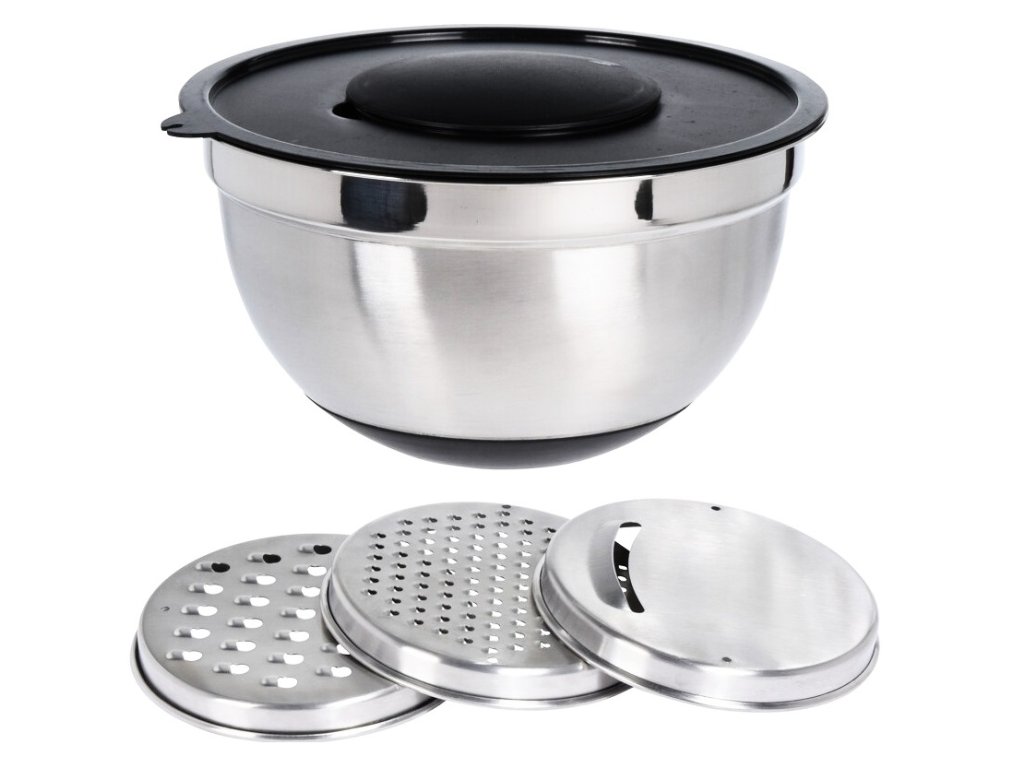 - multifunkční nerezová mísa se třemi struhadly- mísa je vyrobena z nerezavějící oceli a víko je silikonové- mixovací mísa a struhadlo v jednom- díky částečnému otvoru v silikonovém víku můžete mixovat a šlehat bez stříkání- celé víko je samozřejmě plně odnímatelné- při nasazení výměnného struhadla můžete strouhat potraviny přímo do misky- spodní základna mísy má silikonovou úpravu, díky tomu je protiskluzová- šetří Vaši kuchyni od zbytečného nepořádku a uspoří také místo v kuchyni- sada obsahuje 3 různé nástavce na strouhání:- Jemné struhadlo- Hrubé struhadlo- Struhadlo na plátky- rozměry: 25,5 x 14 cmDoplňkové parametry