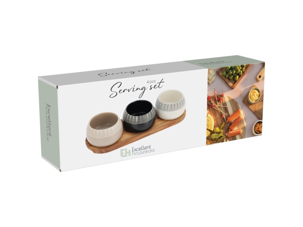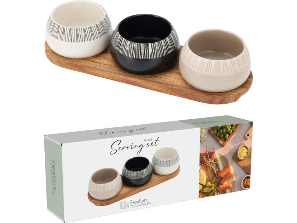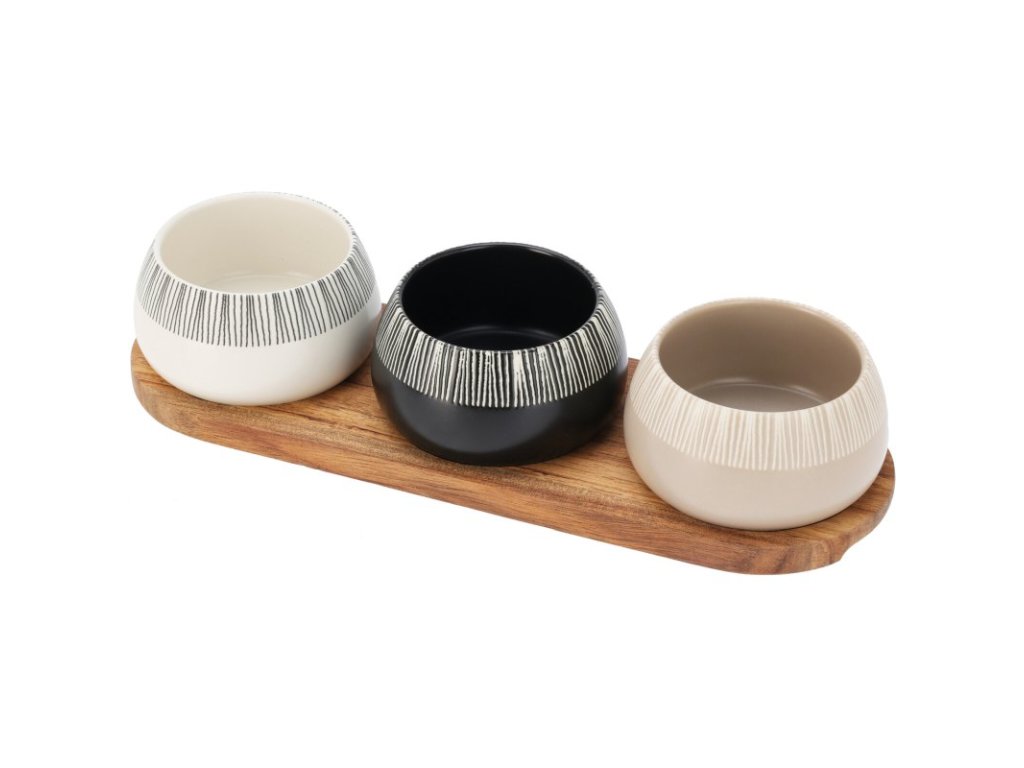Vychutnejte si servírování s vkusem. Tato stylová sada kombinuje rustikální prkénko z akáciového dřeva a tři kameninové misky s jemným proužkovaným vzorem. Ideální pro podávání drobného občerstvení, omáček, oříšků či tapas.